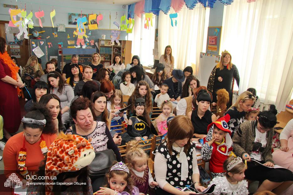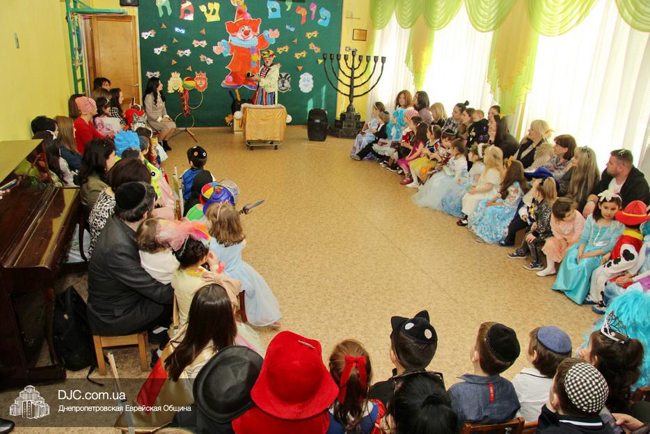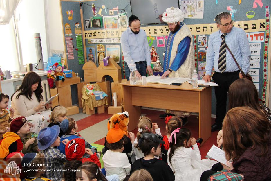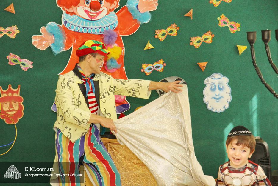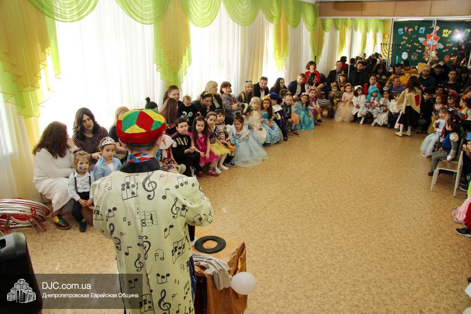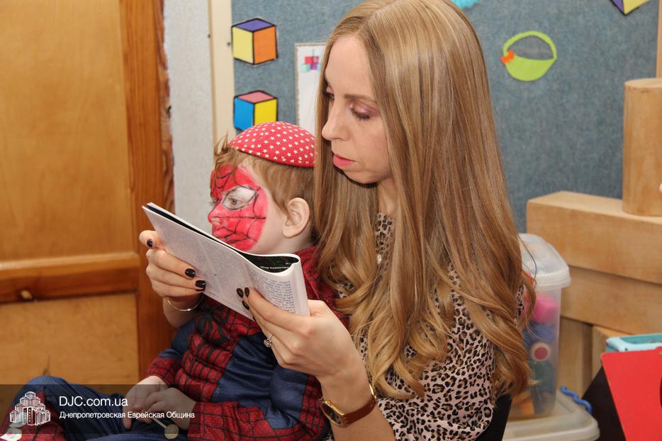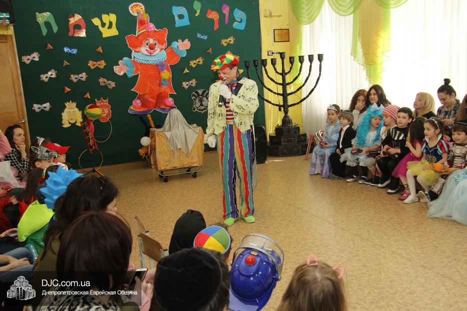 Главное, конечно же, было чтение Свитка Эстер, которое проходило для детей и родителей. Группы разделили на две части: пока в старших группах читали Мегилат Эстер, младшие группы смотрели выступление клоуна, затем произошла ротация, так, чтобы каждый ребенок услышал Мегилу, и чтобы каждый ребенок посмотрел праздничное представление – очень яркое, красочное и интересное.