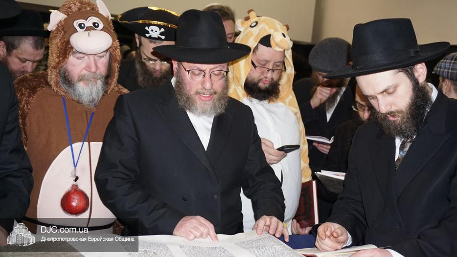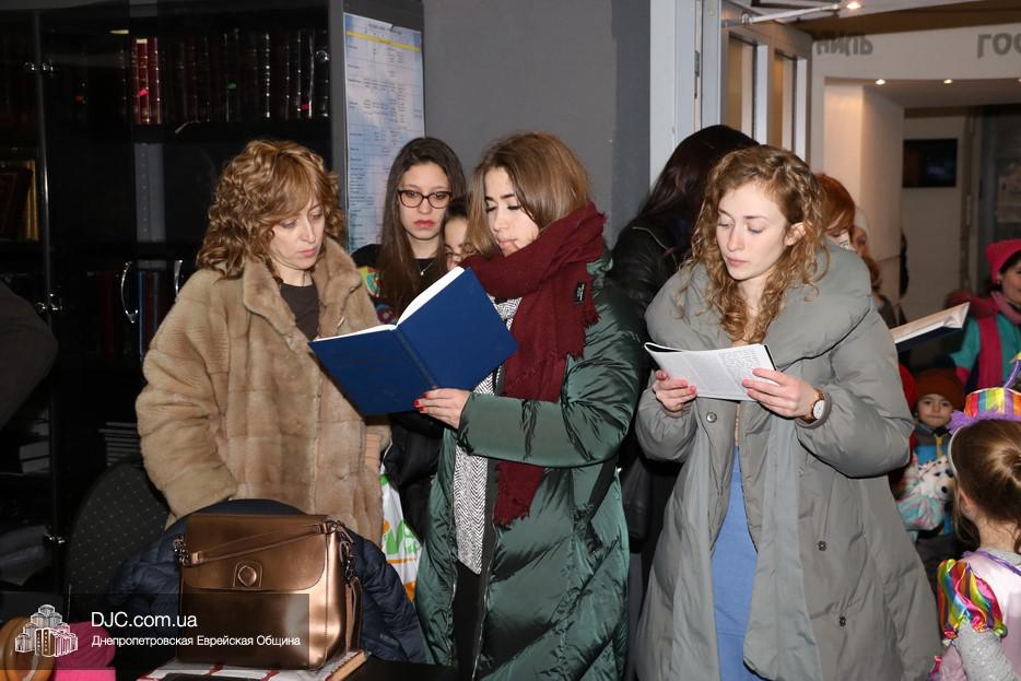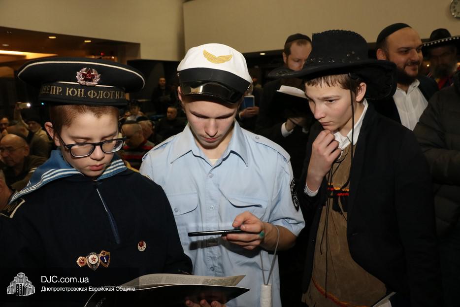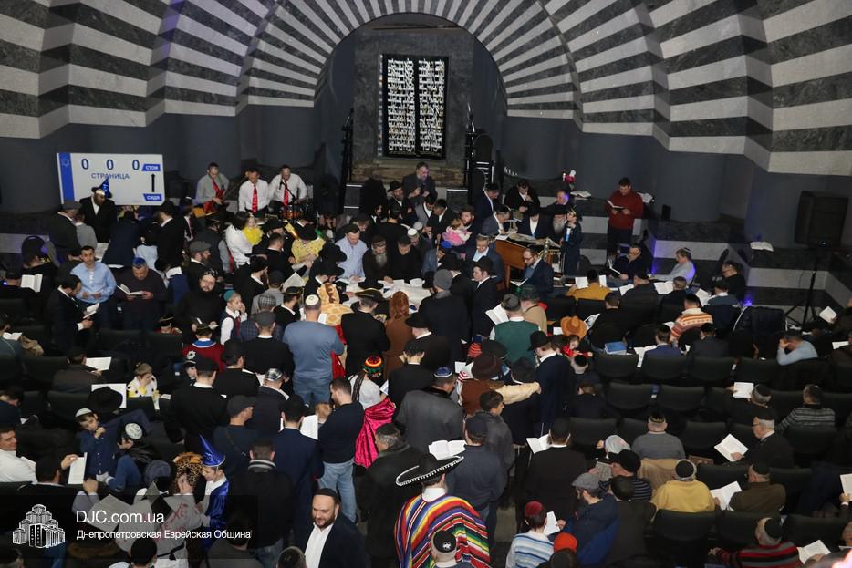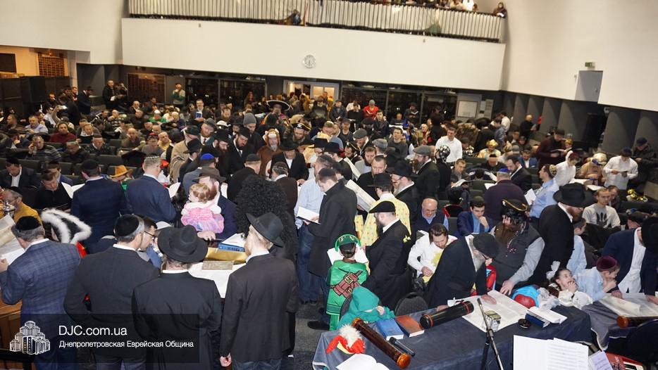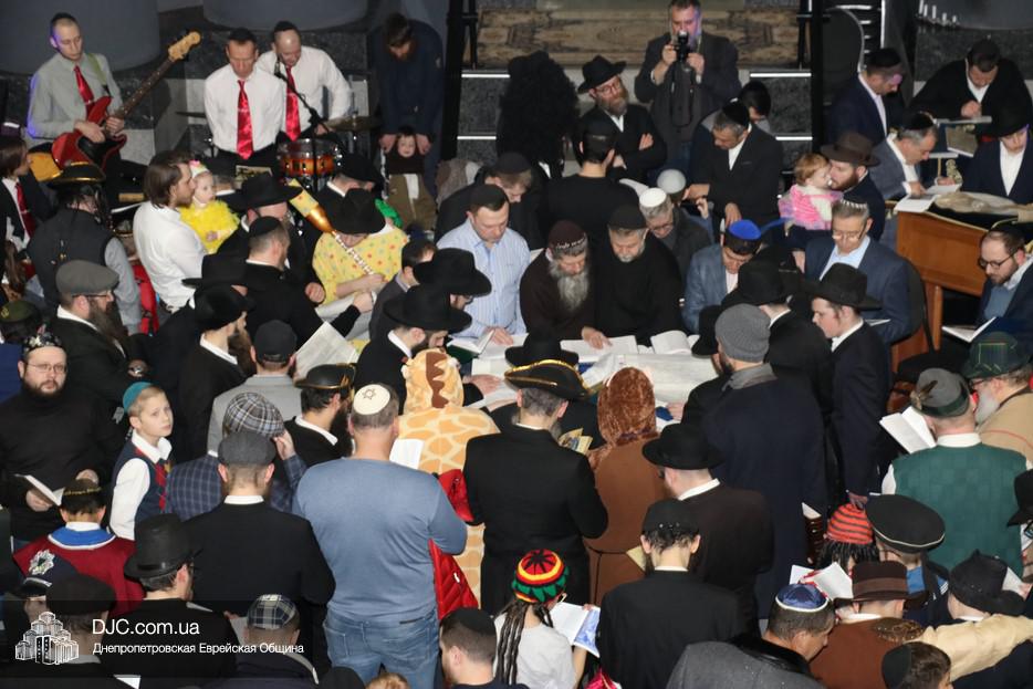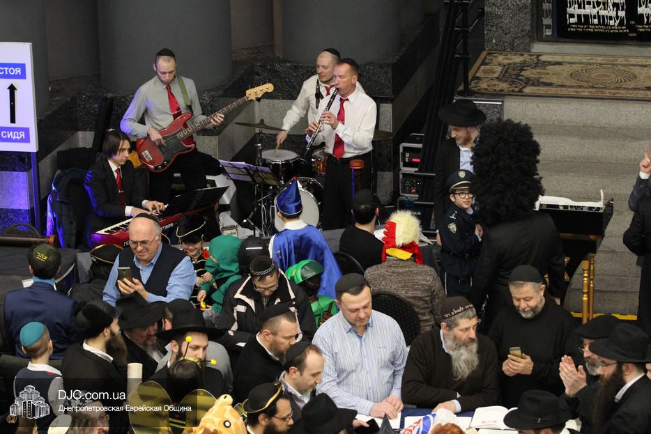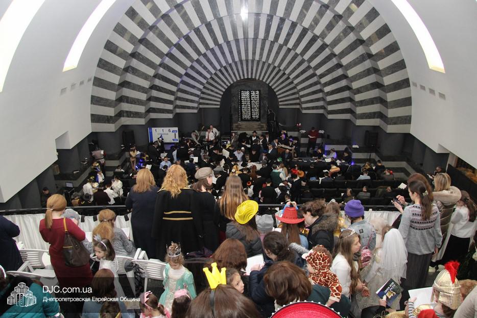 На вечернее чтение Свитка пришли сотни евреев Днепра и атмосфера в зале была весьма необычной не только потому, что многие – как взрослые, так и дети – были в карнавальных костюмах, но и потому, что у восточной стены, слева от Арон Кодеша расположился оркестр, который еще до начала чтения создавал пуримскую атмосеру, играя веселые еврейские мелодии.