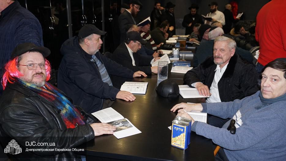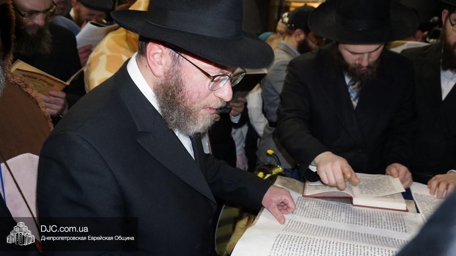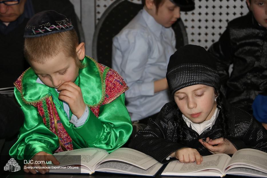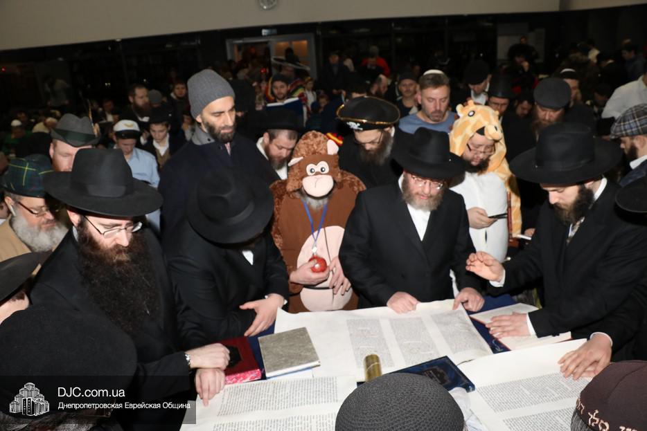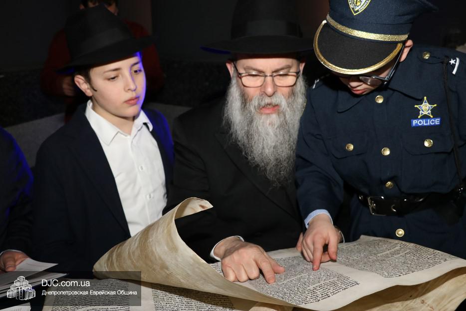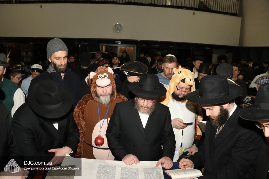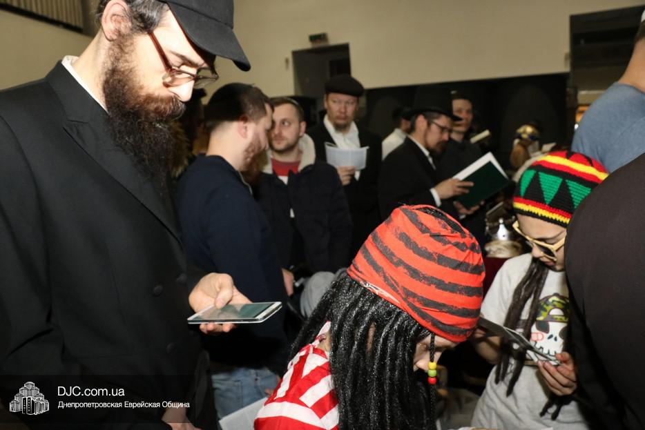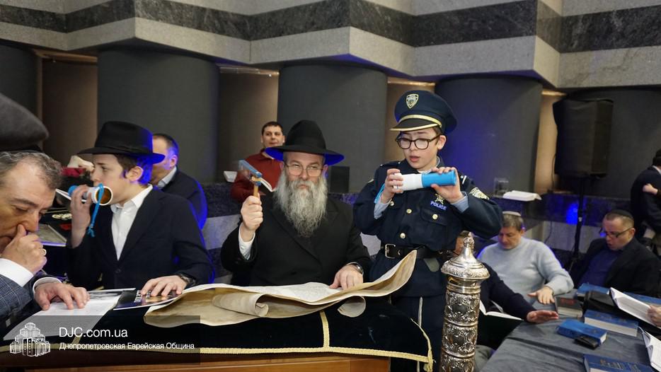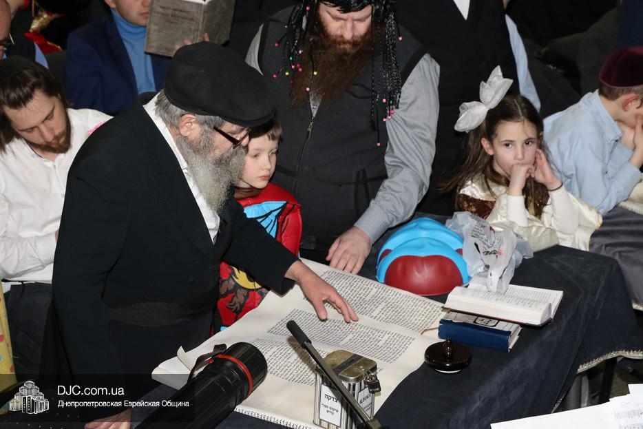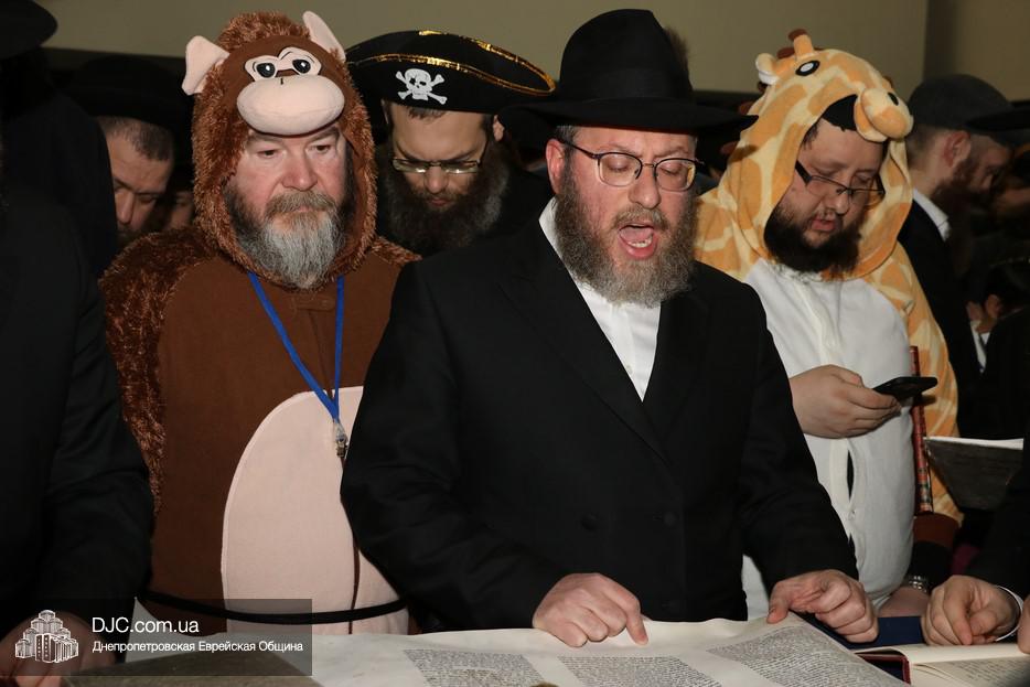 Свиток Эстер громко и эмоционально читал вслух раввин Мойше Лейб Вебер, один из руководителей проекта «Колель Тора», а все присутствующие внимательно слушали, одновременно читая текст по рукописным свиткам, печатным изданиям и, даже, по электронным версиям в своих мобильных устройствах. В местах, где положено «заглушать» (и тем самым – стирать) имя главного злодея, в синагоге поднимался невообразимы шум, дополнительно поддерживаемый оркестром.