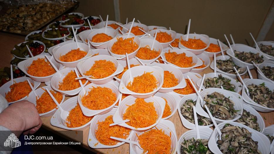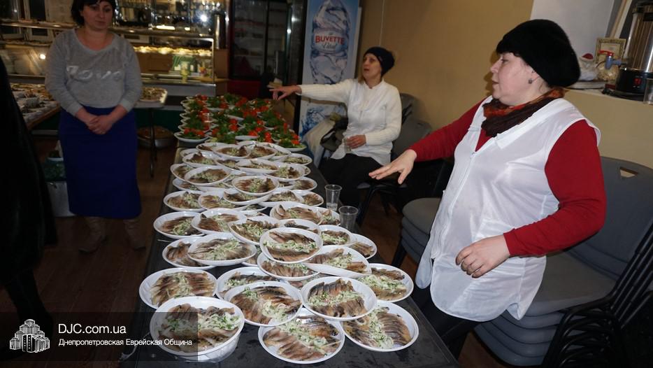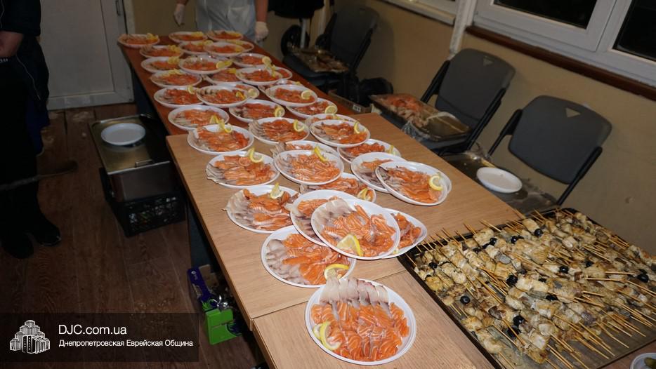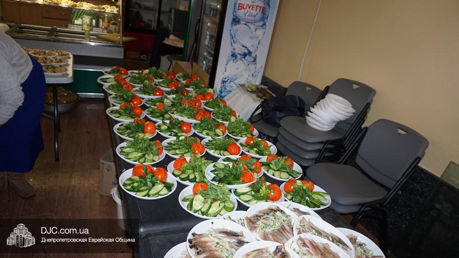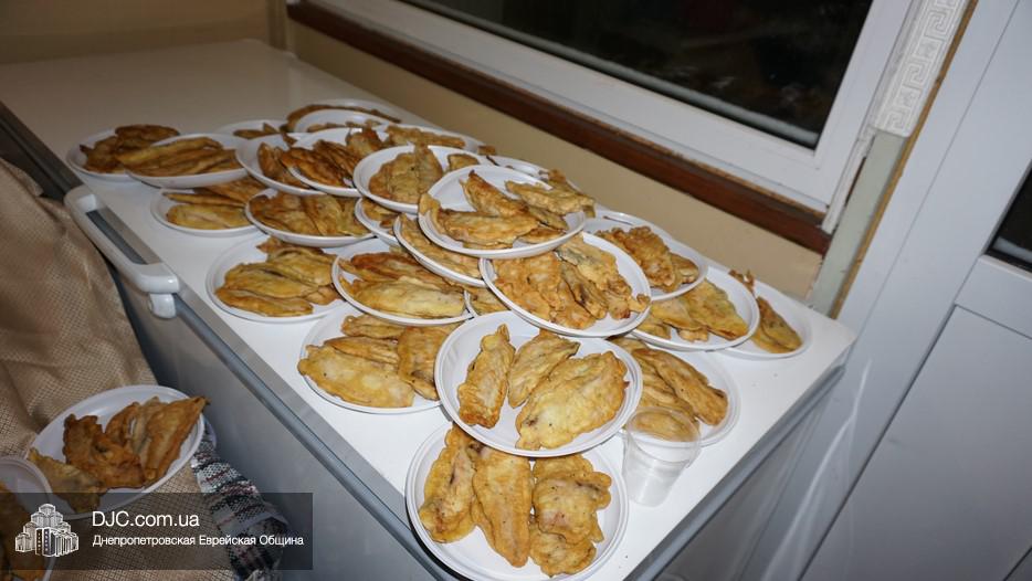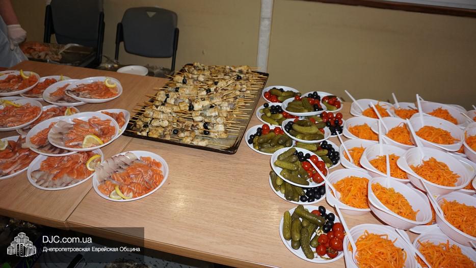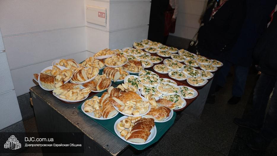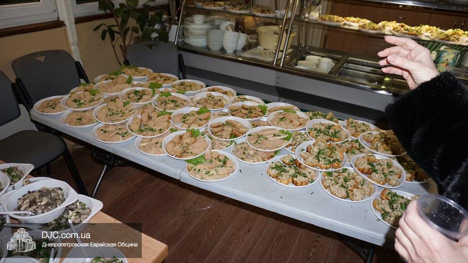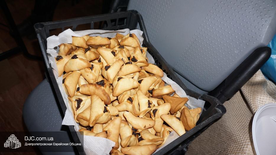 После окончания чтения Свитка и завершения предшествующего празднику поста, в главном зале была оперативно сервирована большая трапеза, которая вполне подходила под определение – «пир». Тут были самые разнообразные закуски – овощные и рыбные, включая красную рыбу, горбушу и другие многочисленные деликатесы, основные блюда и особое пуримское лакомство – гоменташн. Угощения было обильное и очень вкусное – повара дома для пожилого человека «Бейт Барух» постарались на славу.