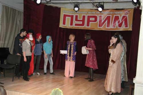 Каждый мог поучаствовать в одной или нескольких станциях, а мог просто медитировать под ритмичный стук барабанов в ожидании главной части праздника – спектакля. Спектакль начала, как и положено на Востоке, Шехерезада, которая подробно пересказала содержание свитка Эстер, а затем раздала всем присутствующим экземпляры брошюры с текстом свитка. После того как все ознакомились с либретто постановки, выяснилось, что мадрихи ЕОЦ и активисты подросткового клуба «Кадима» решили применить принцип «все наоборот» к самой пуримской истории.