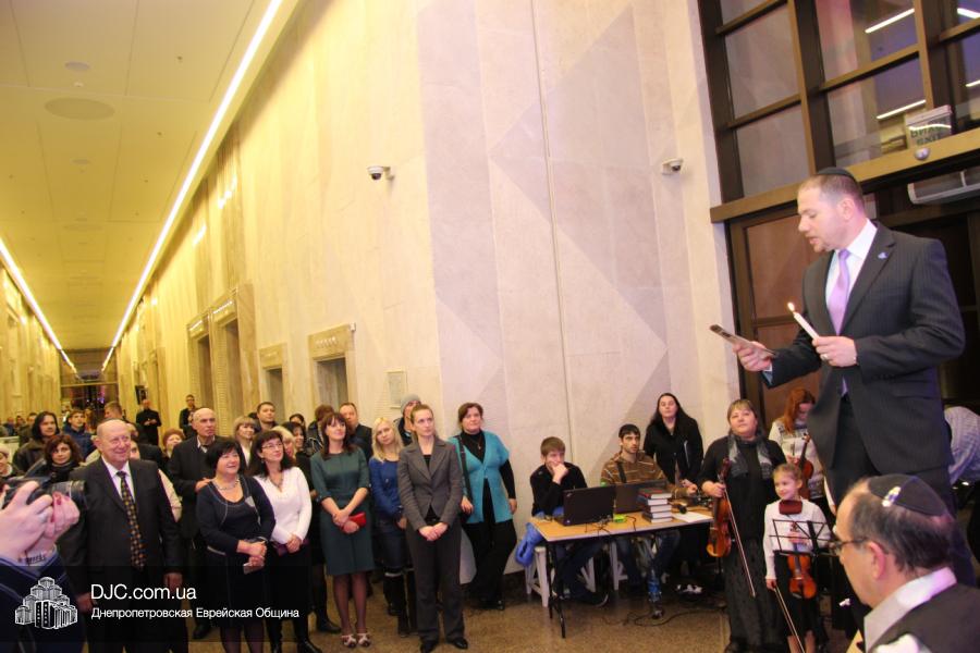 Йонатан Лейфер прочитал благословения и под дружное «амен» присутствующих зажег масляные светильники на большой серебряной Меноре, расположенной на перекрестке Галерей центра. После того как Ханукальные огни были зажжены, Йонатан Лейфер обратился к собравшимся с теплыми поздравлениями, со словами благодарности команде Джойнта и поддерживаемых им структур за ту работу, которую они делают каждый день, помогая людям не только в праздники, но и в будни. С особой благодарностью Йонатан Лейфер обратился к директору центра Менора Светлане Ермаковой: «В этом здании есть много прекрасных организаций, которые помогают сделать жизнь лучше, и это дает нам надежду», – сказал он.