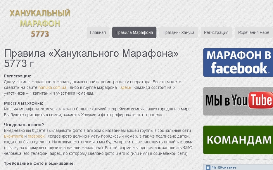 Для участия в марафоне команды должны пройти регистрацию у оператора. Вы это можете сделать на сайте hanuka.com.ua, либо в группе марафона в сети «ВКонтакте». Команда состоит из 5 участников – 1 капитан и 4 участника команды.