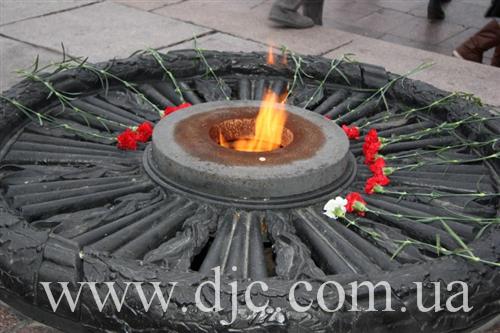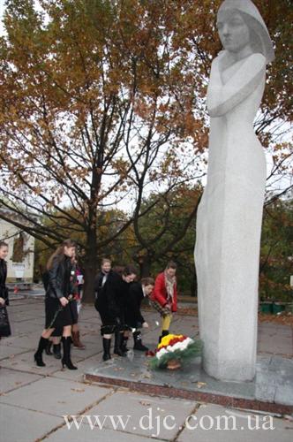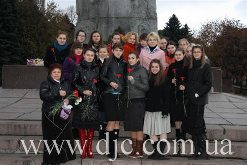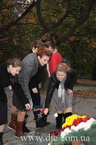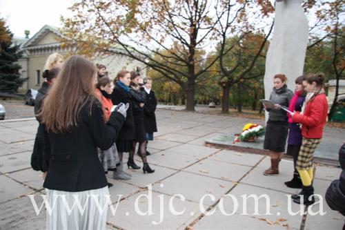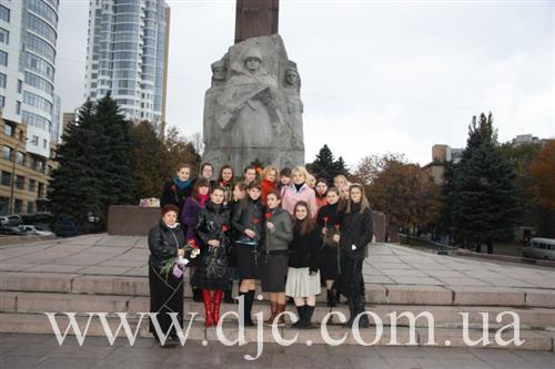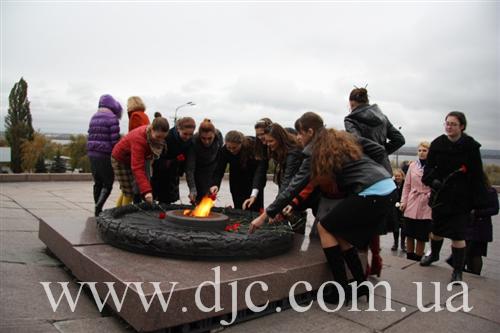 Студентки возложили цветы к вечному огню у мемориала Славы, что высится на крутом днепровском берегу в самом начале центрального проспекта города, а затем к монументу Скорбящей, посвященному памяти днепропетровских студентов, погибших в боях за город, и отдавших свою жизнь на фронтах Второй Мировой войны.