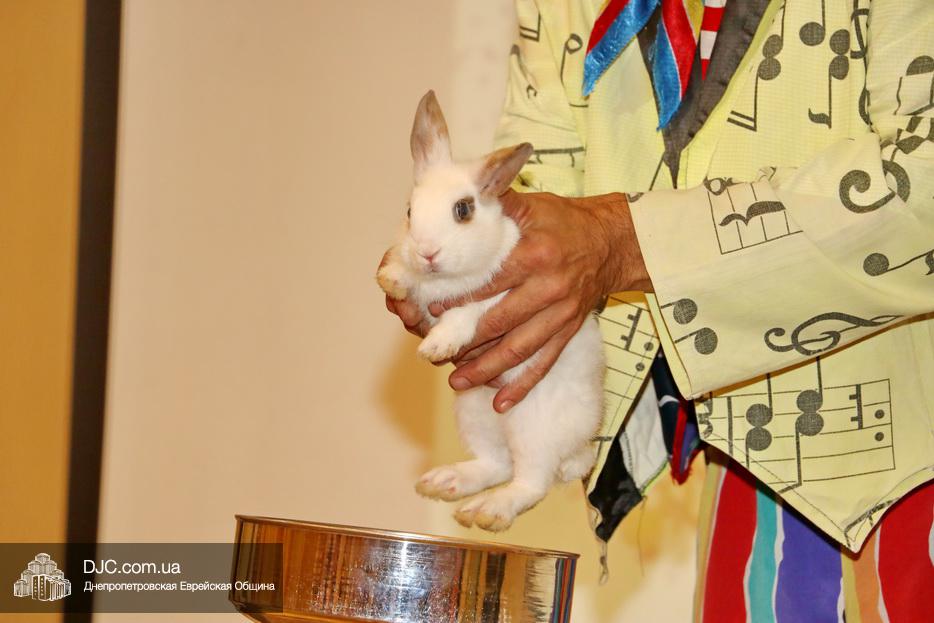 Выступление «атрактивного цирка» очень понравилось детям и взрослым. Здесь были классические номера эстрадно-циркового искусства: жонглирование, фокусы, но главное – номера с дрессированными животными: глубями, кроликами и настоящим пуделем. Многие дети смогли попробовать себя в роли цирковых артистов, принимая участие в том или ином номере, и это доставило всем очень много радости, что и было основной целью устроителей праздника, ибо радость – один из важнейших атрибутов праздника Суккот.