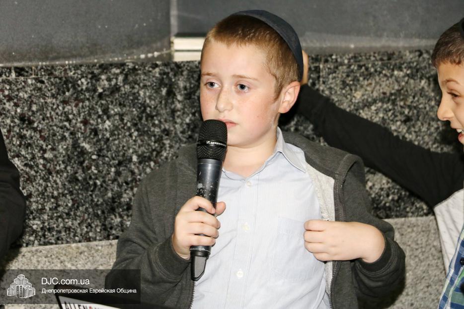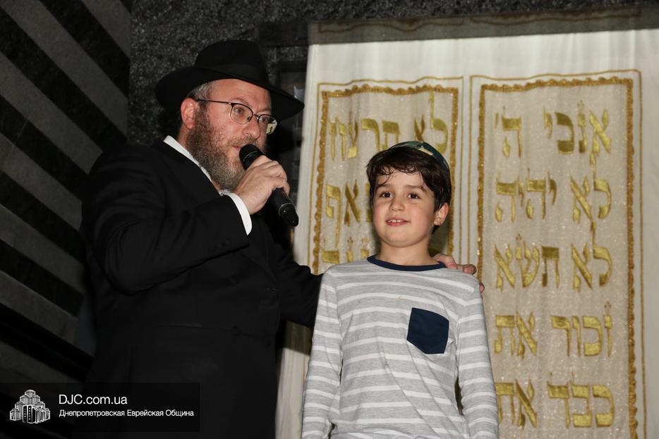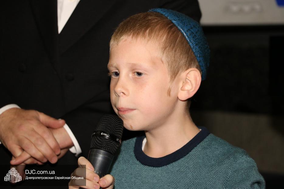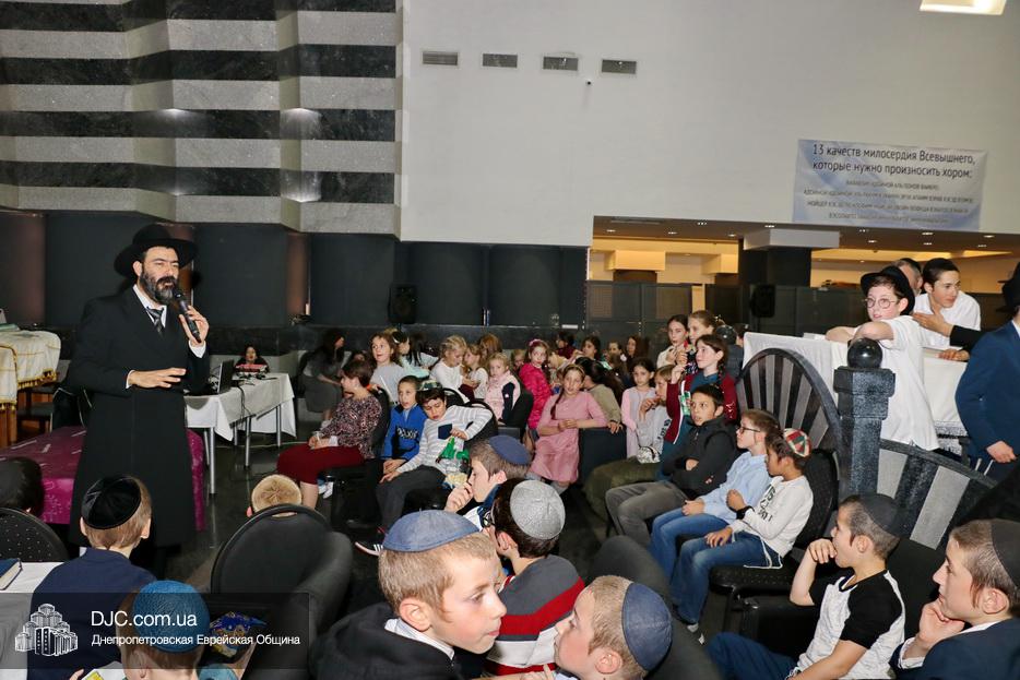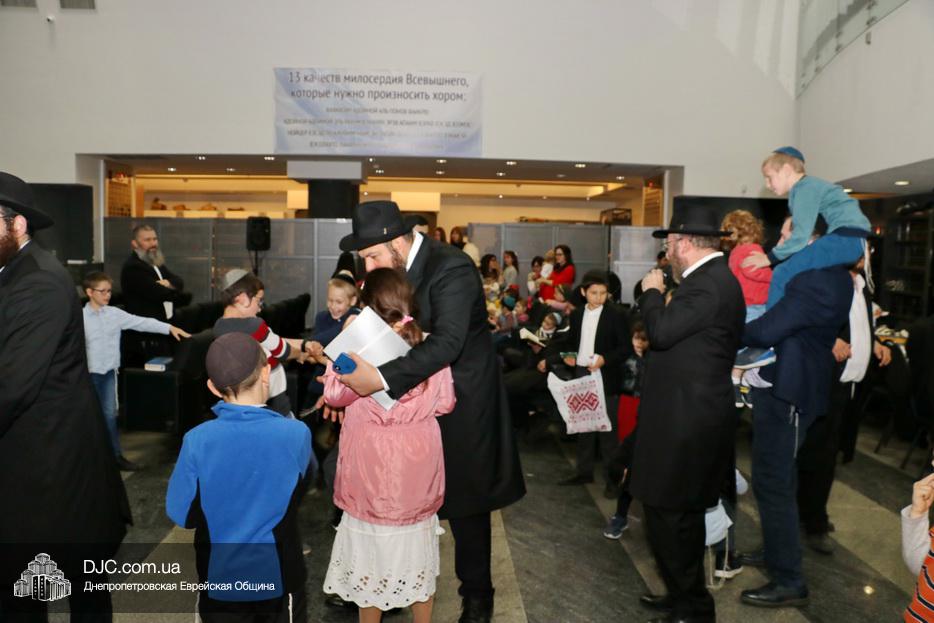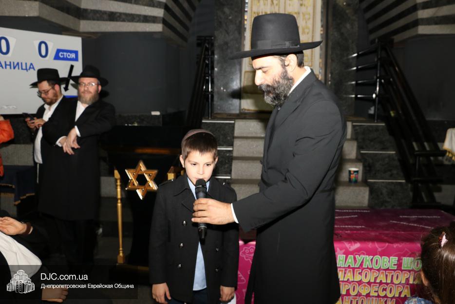 Затем дети расселись вокруг бимы, а к ним с речью обратился сначала раввин Мойше Лейб Вебер, который предоставил слово особому гостю праздника раввину аэропорта «Бен Гурион» (Израиль) Ниссиму Эльмалиаху, посетившему Днепр в период праздников месяца Тишрей.