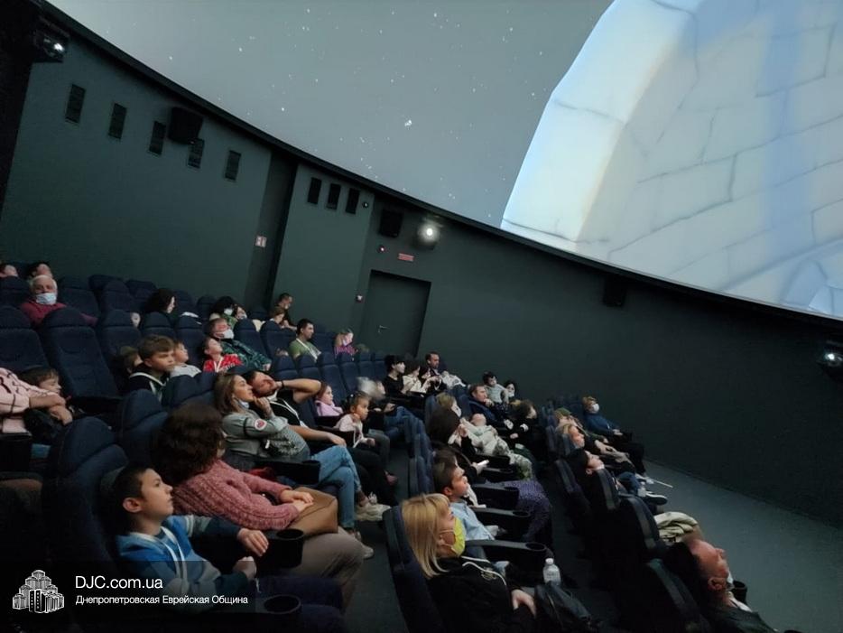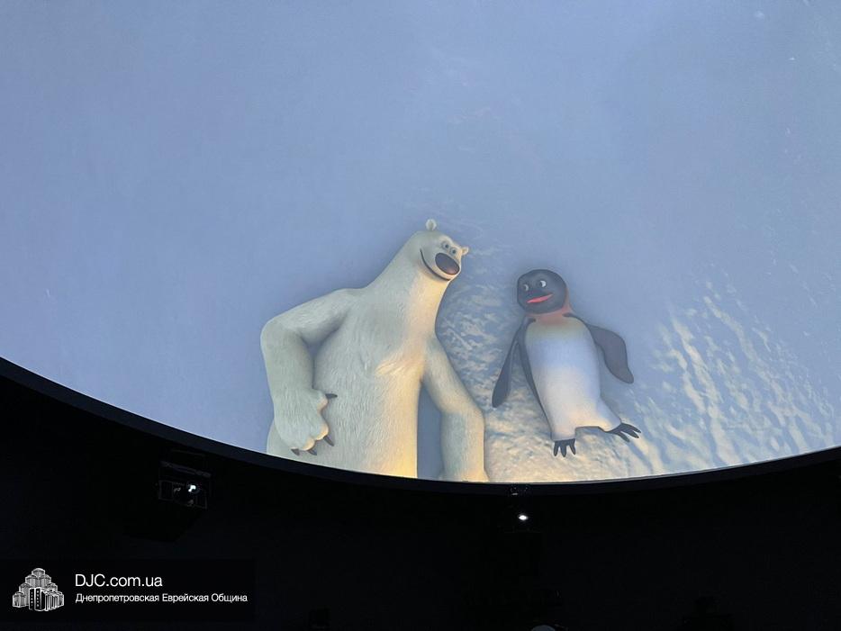 Затем мы все вместе – воспитатели, воспитанники и их родители – отправились на представление в планетарий. Это было очень весело и увлекательно, вместе с пингвином-путешественником Джеймсом Гибернатусом и смешным медведем Потапом Медведько наши малыши наблюдали за звездами, удивляясь долгим ночам на полюсах Земли, во время путешествия дети познакомили с Марсом и Сатурном и обнаружили, что планеты имеют не только сходства, но и различия. Также был просмотр фильма в звездном зале и живая лекция-путешествие по звездному небу и ответы на все вопросы.