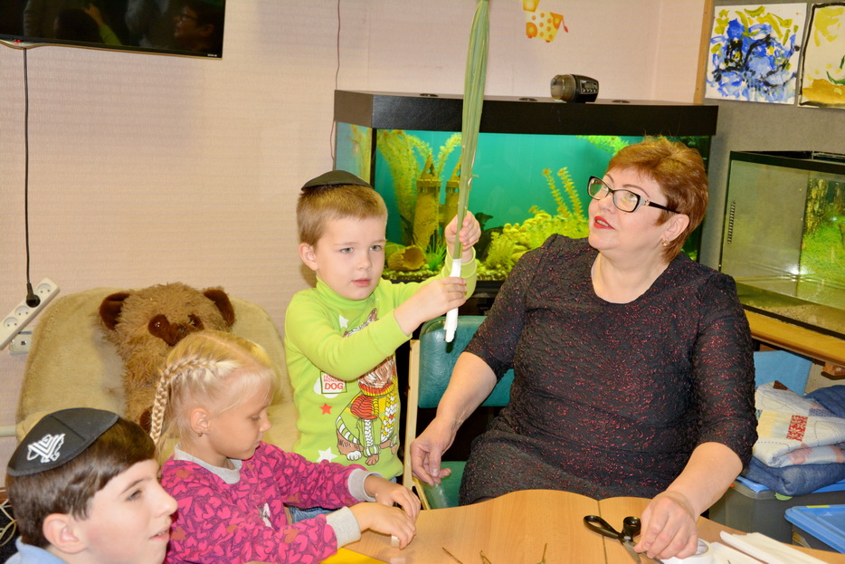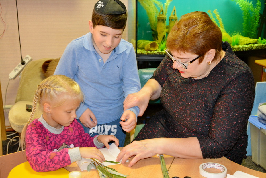На занятии, посвященном празднику Суккот, дети более подробно познакомились с традициями празднования: трапезы в сукке, натилат лулав. Со своим преподавателем Людмилой Валерьевной Навротской дети изготовили собственными руками настоящий лулав и с его помощью выполнили одну из заповедей праздника – натилат лулав.