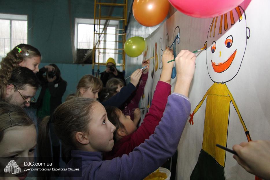 Но преодолев все препятствия – а может это и было первое состязание на дружбу и взаимопомощь, ибо при заносе колясок не раз вспоминалось «надеемся только на крепость рук, на руки друга…» – в зале всех ожидало вкусное угощение, горячий чай, ханукальные пончики и большой щит с нанесенным контуром рисунка, который можно было раскрашивать. Дружба маленьких и взрослых тут же проявилась, ибо верхнюю часть плаката, конечно же, удобнее разрисовывать сидя на плечах надежного друга.