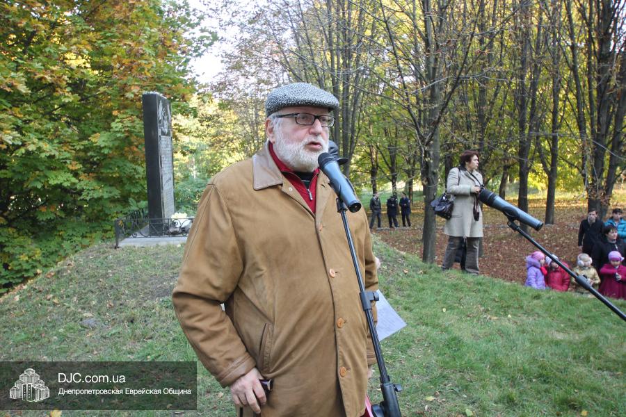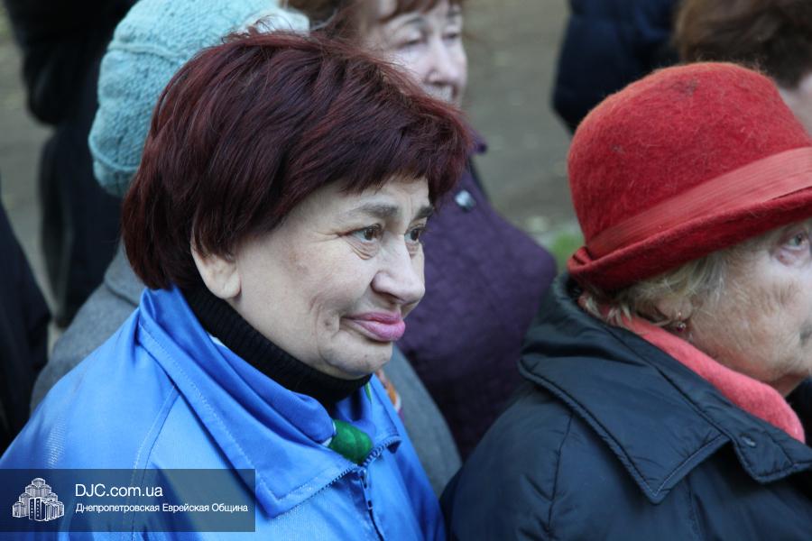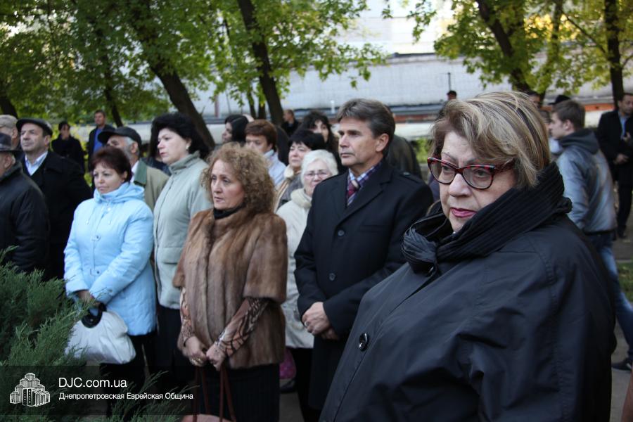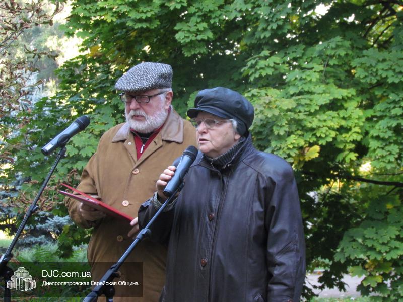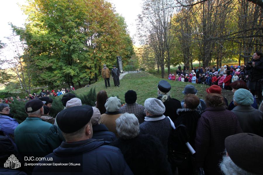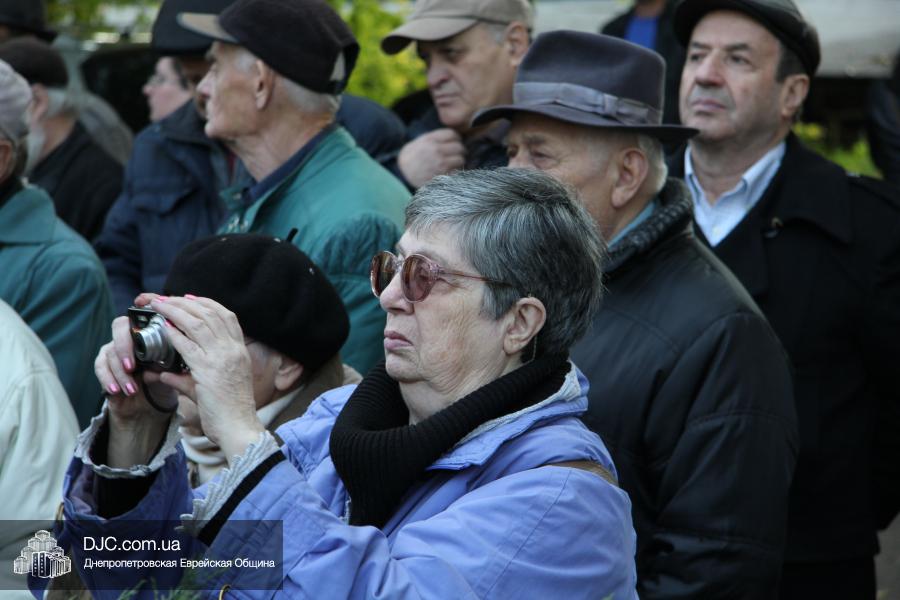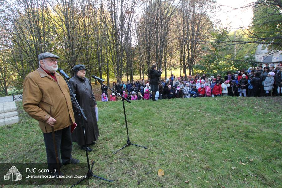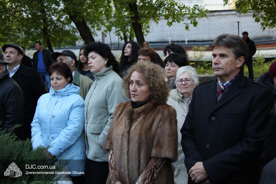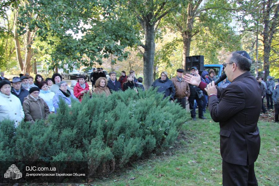 Ведущей траурной церемонии традиционно была Алла Григорьевна Гельберг, много лет преподававшая историю в еврейской школе нашего города. Вступительное слово было предоставлено управляющему делами днепропетровской общины Александру Фридкису. Он напомнил собравшимся, что траурные церемонии в память 11-ти тысяч жертв массовых расстрелов евреев в днепропетровском Ботаническом саду, невзирая на запреты и преследования советского режима, стали проводиться благодаря пионерам еврейского возрождения Авигдору Рабкину, Боруху Цейтлину и Виктору Гукину. Затем эта традиция была продолжена лидерами нашей общины Григорием Натановичем Королем и Аркадием Леонидовичем Шмистом (да будет благословенна их память). С тех пор ежегодно, более двадцати лет, евреи Днепропетровска проводят масштабные траурные мероприятия на месте, где были безвинно уничтожены их предки в 1941 году.