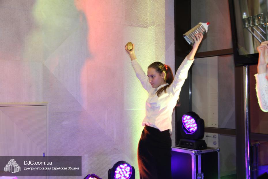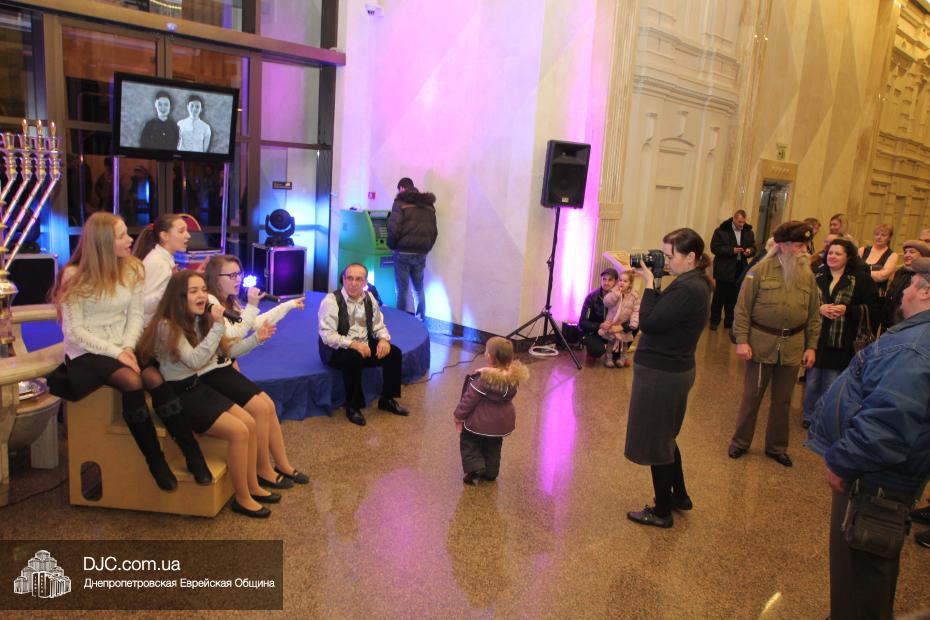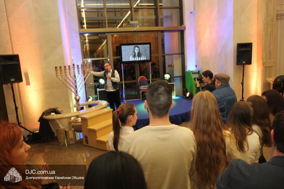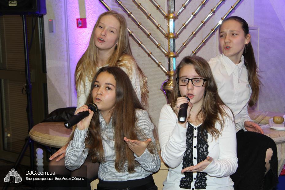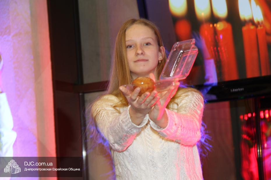 Затем все получили возможность угоститься пончиками, приготовленными рестораном центра «Менора», а известный шоумен и певец Яков Роговой пригласил на сцену участниц молодежного клуба ЕА «Сохнут-Украина» – Яну Когун, Дарью Новикову, Валерию Милютину и Ирину Волошину, подготовивших к своему выступлению песенное попурри на тему Хануки.