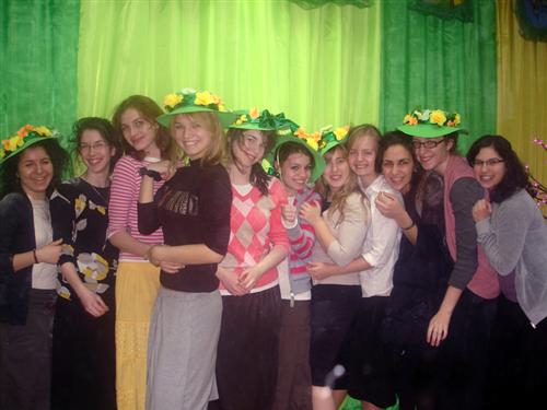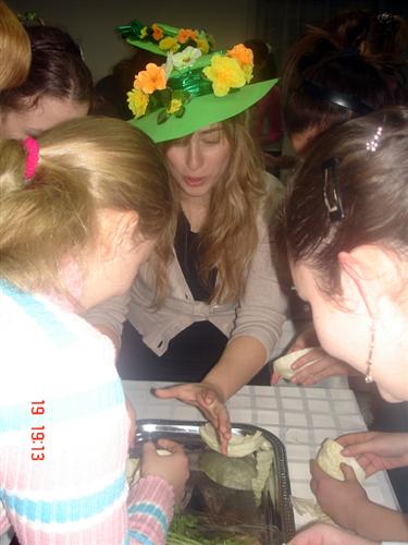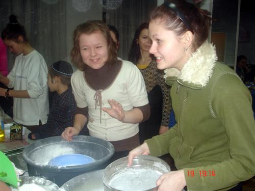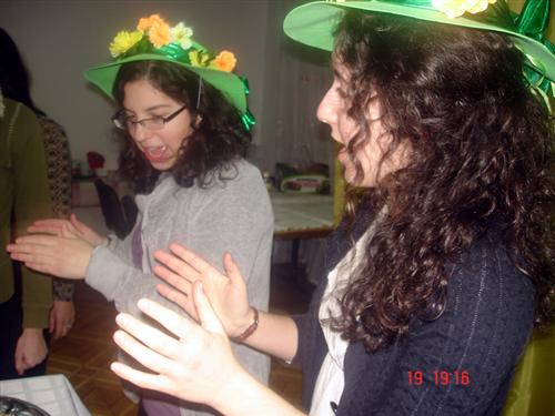 Педагог и наставница студенток Рахель Мильман подготовила интересную игровую программу, посвященную вопросам кашрута и практическим навыкам приготовления кошерной пищи. «Каждая еврейская девушка должна знать законы кашрута, поэтому сегодня мы с вами вспомним основные из них: отделение халы, проверка продуктов перед приготовлением и употреблением в еду», — так Рахель начала вечер. Девушки не только познавательно, но и весело провели время – учились правильно просеивать муку, проверять соответствие кашруту яиц, капусты, зелени; они танцевали и играли. Праздник обогатили яркие декорации игровой площадки, а также головные уборы девочек, которые изготовила для них художница Людмила Навротская. Их сочным весенним краскам радовались не только глаза, но и девичьи сердца!