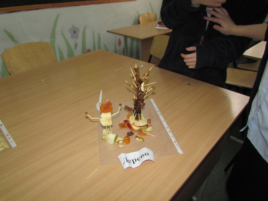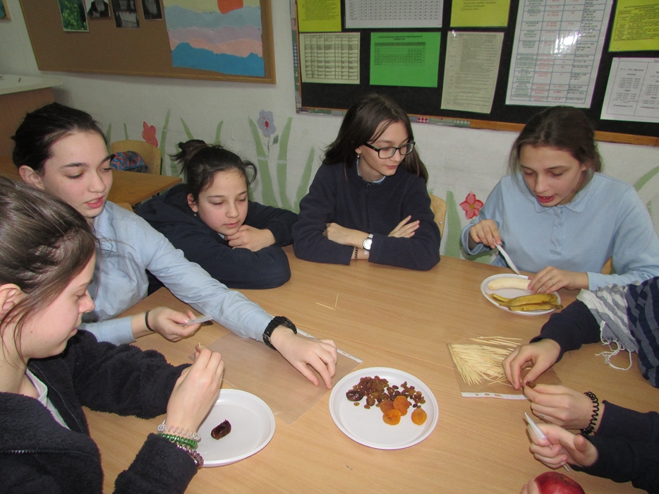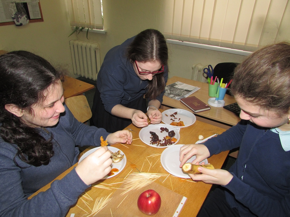 Воспитанницы 5-8 классов просмотрели видео Ребе о значении этого дня в еврейской традиции, а затем получили задание сделать из фруктов и сухофруктов поделку, символизирующую человека или дерево.