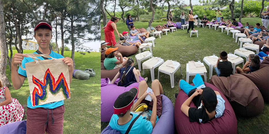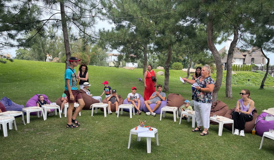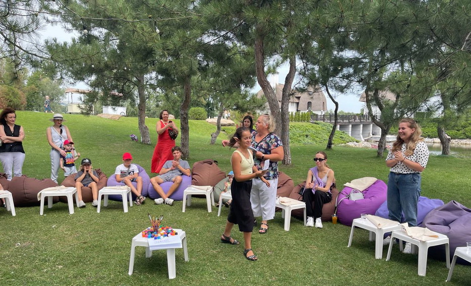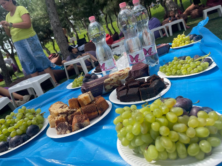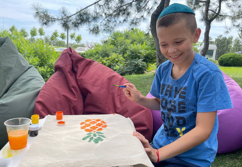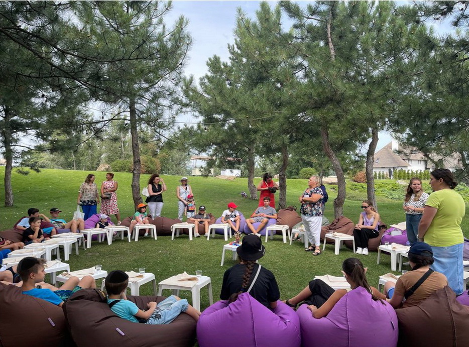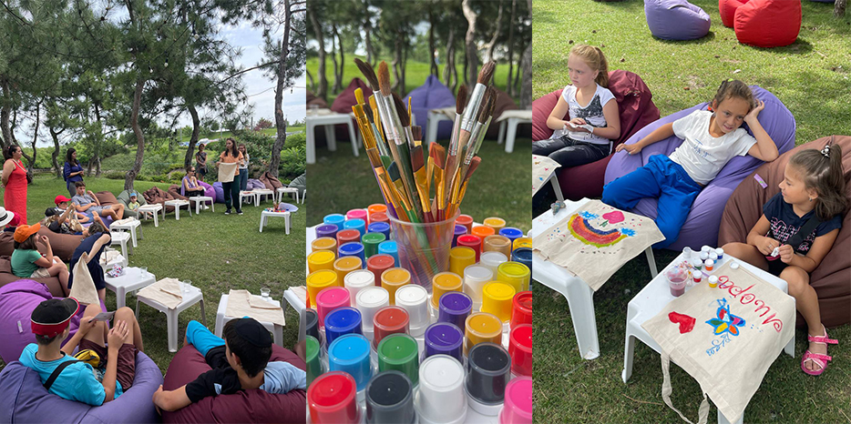 Потім, поки шопери висихали під палючими променями сонечка, волонтери з дітьми розмістилися на м’яких пуфах у затишку, у дружньому родинному колі спілкувалися на актуальні та важливі теми, дітлахи ділилися своїми переживаннями та бажаннями. Як в справжній єврейській родині, в сімейному колі, за цікавою та жвавою розмовою, ми сиділи і смакували кошерними тістечками та солодкими фруктами.