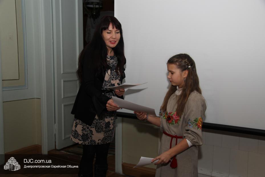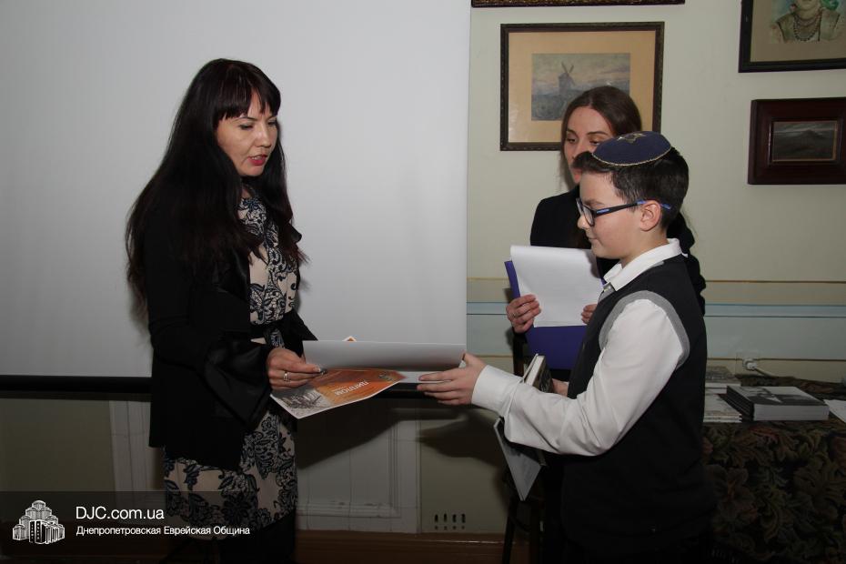 Награды и подарки от Днепропетровского Исторического музея имени Д. Яворницкого и его филиала Мемориального дома-музея академика Д.И. Яворницкого вручала заведующая домом-музеем Яна Тимошенко, которая отметила высокий уровень исторического образования и патриотического воспитания в еврейской школе.