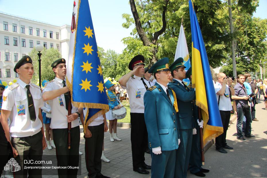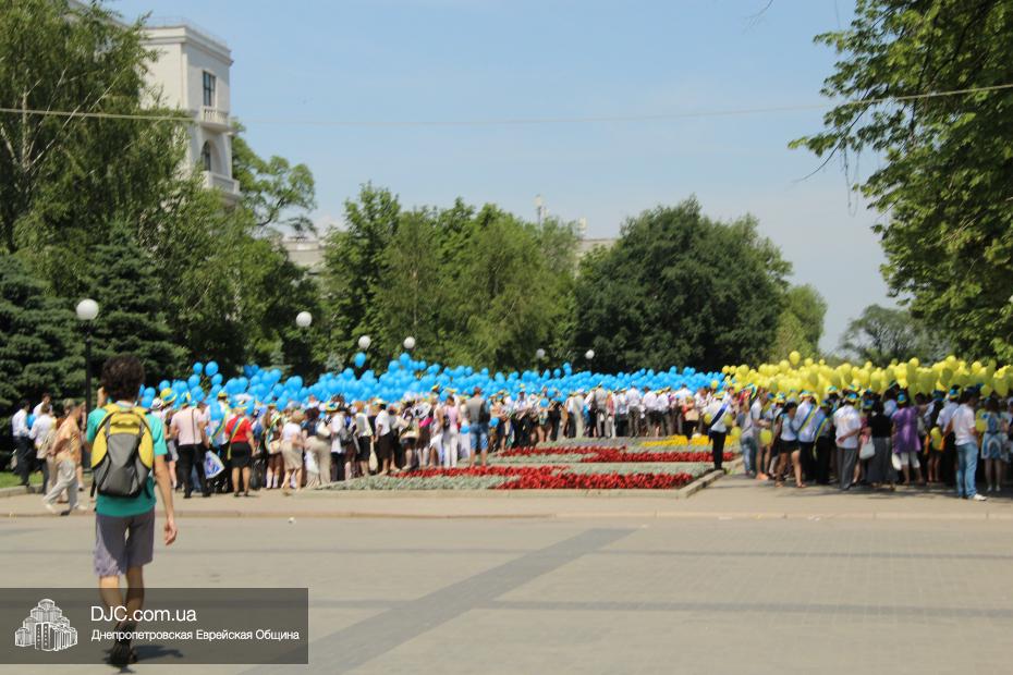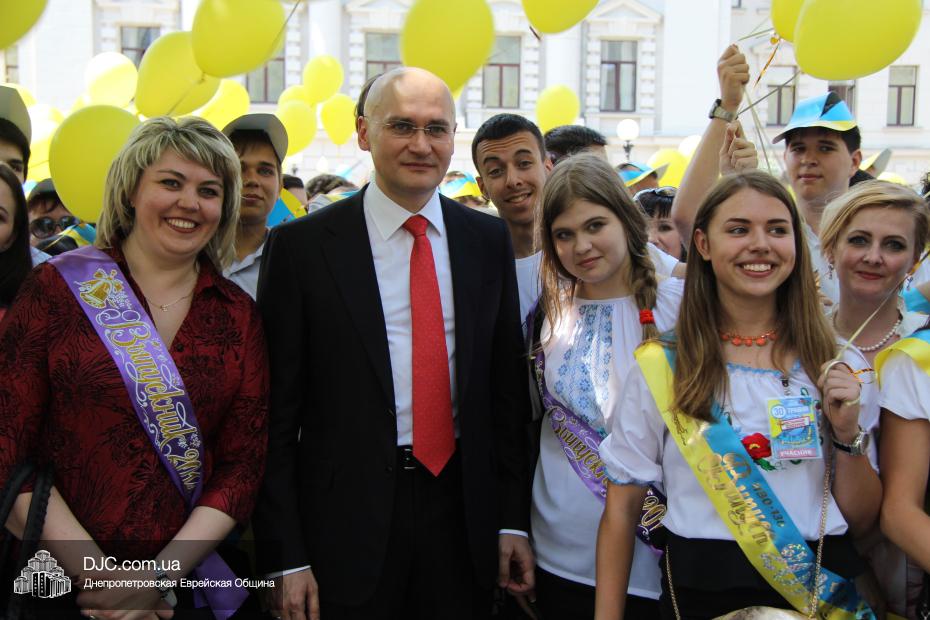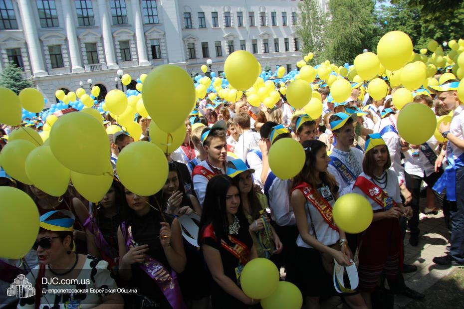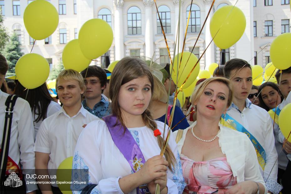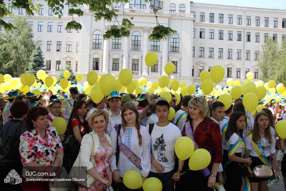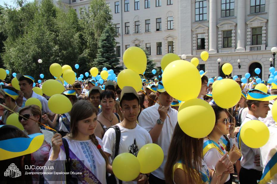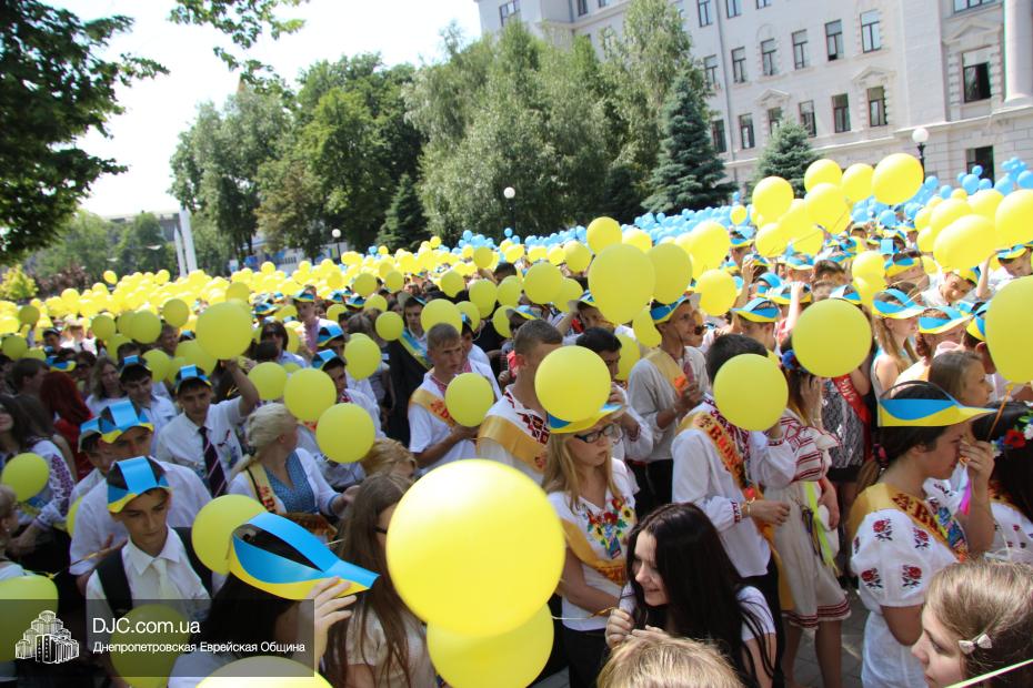 «Для меня и для ребят из нашего одиннадцатого класса это очень важно – быть здесь вместе с нашими замечательными учителями – завучем Татьяной Анатольевной Хавкиной и классным руководителем Аллой Николаевной Литвиненко, вместе со всеми другими выпускниками, — сказала нашему сайту выпускница еврейской школы Надежда Дегтярева, которая, как и многие участники парада, пришла в национальной украинской вышиванке, — нас очень тепло поздравили и напутствовали руководители области – председатель облсовета Евгений Удод, замгубернатора Борис Филатов и советник губернатора Борис Трейгерман. Мы создаем из воздушных шариков огромный флаг нашей прекрасной страны, которую мы любим, которой мы гордимся, и которая, с Б-жей помощью, скоро будет гордиться нами! Мы сделаем для этого все!»