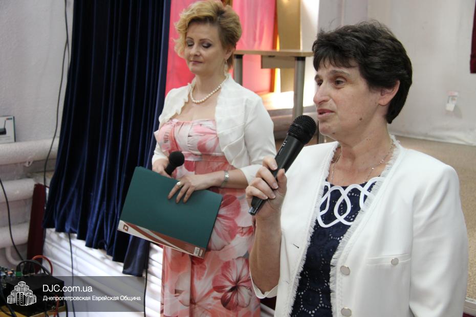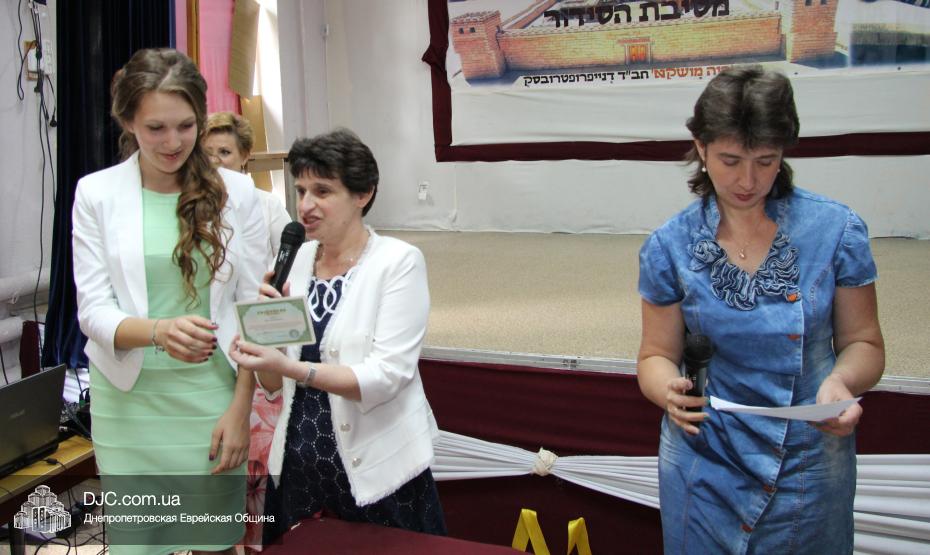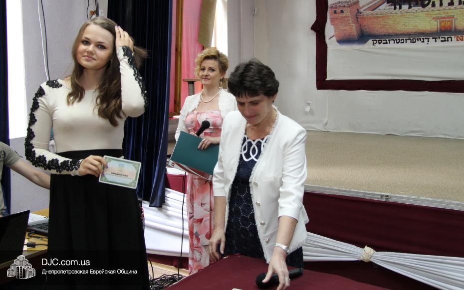 Вручение аттестатов провели директор школы Елена Краснова и завуч по учебной части Татьяна Ивашкова. Первым был вручен аттестат, который имеет особый статус – он «с отличием», то есть по сути, является медалью для девятиклассников. Этот «золотой» аттестат был, под всеобщие аплодисменты, вручен Дарье Цопе, одной из самых ярких «звезд» нашей еврейской школы.