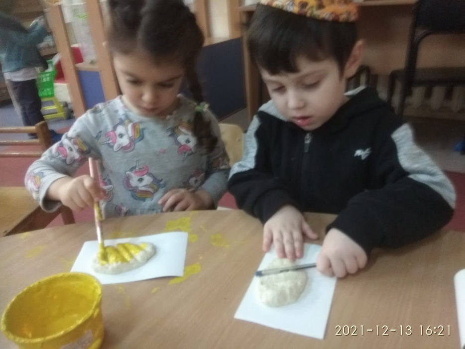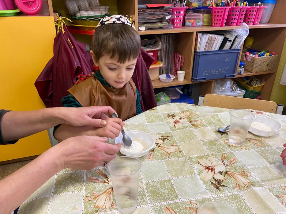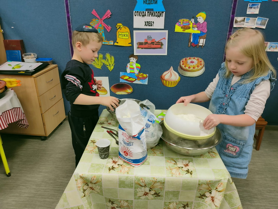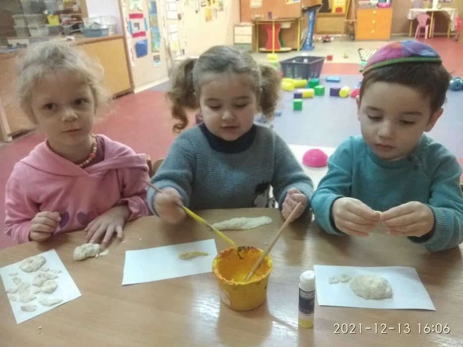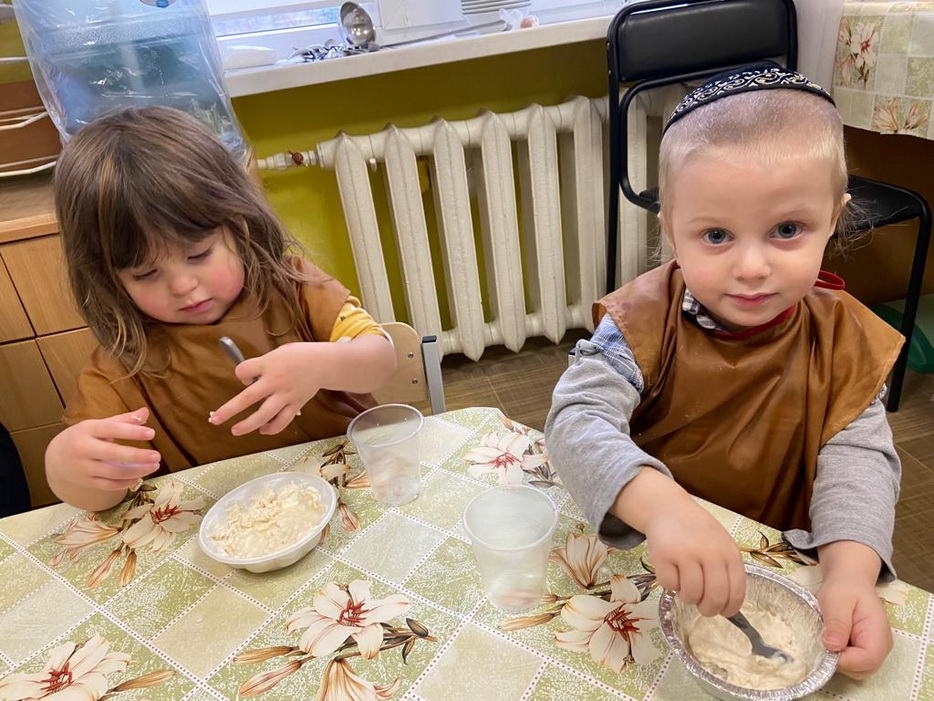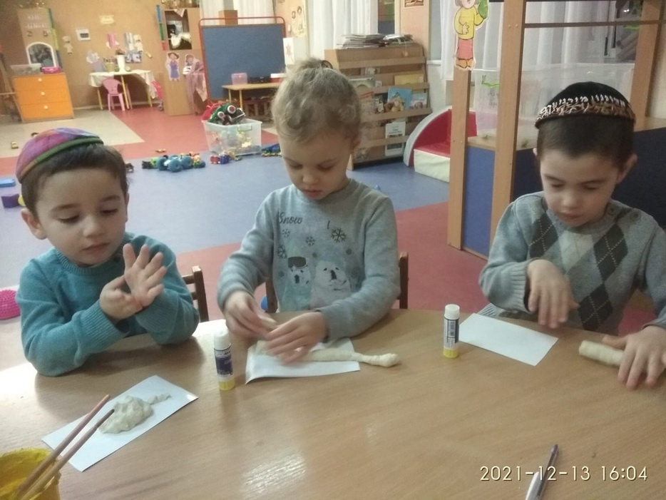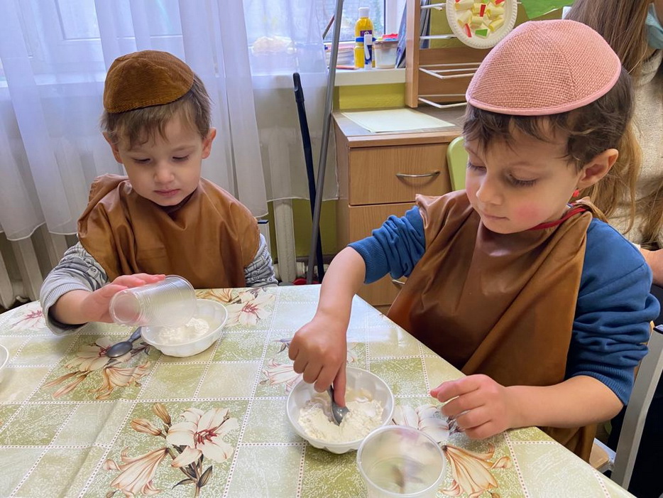 Но и как всем нам, тем более детям и малышам, недостаточно только слушать, поэтому в каждой группе проходил отдельный процесс: кто-то лепил халы, кто-то – хлеб, а некоторые группы делали торт.