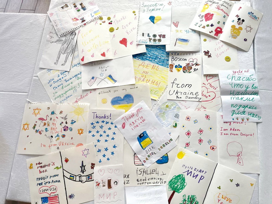Дякуємо нашим Бостонським друзям за подарунки! Кожна дитина отримала не тільки рюкзачок з канцтоварами та приладдям для творчості, а й особисту листівку. В знак вдячності – ми зробили плакат «Дніпро-Бостон» та листівки для друзів в Бостон!