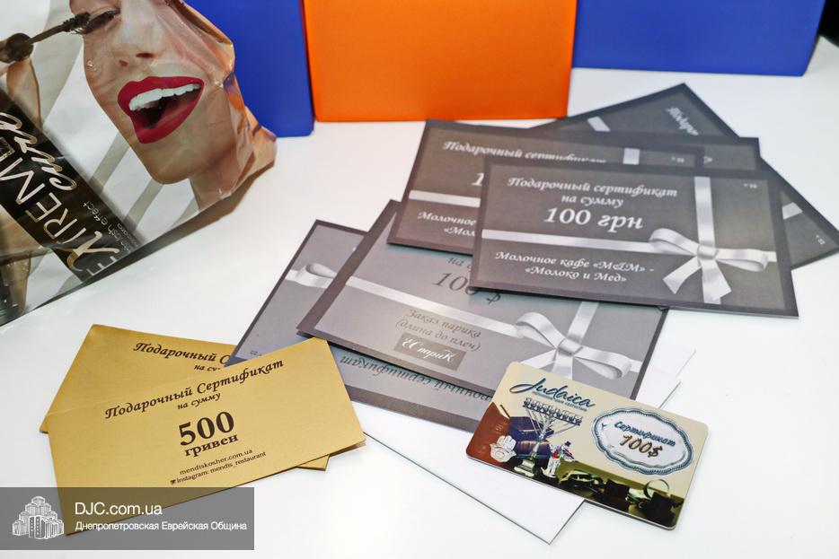 Кроме благотворительного аукциона прошли также викторина и лотерея, в ходе которой были разыграны прекрасные призы. Они, как рассказала нашему сайту одна из организаторов Илана Шполянская-Ханелес, были предоставлены магазинами «Le Silpo» и «Иудаика», ресторанами «Mendis», «Молоко и Мед» и «Coffee Life», компанией «Парики от Лены», представителем косметической компании «Farmasi» Светланой Музыкиной и Федерацией еврейских общин Украины. Каждая женщина, пришедшая на фарбренген, получала билет на участие в лотерее, но, кроме того, дополнительные билеты можно было выиграть, правильно ответив на вопросы викторины, посвященной Дню Свадьбы Ребе.