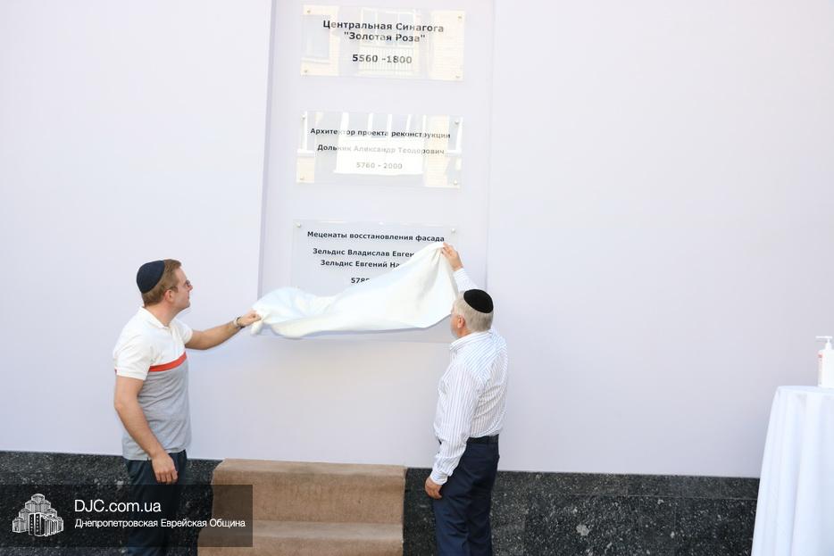 Кульминацией праздника стало открытие памятной таблички в честь меценатов восстановления фасада синагоги – членов Попечительского Совета общины Днепра Евгения и Владислава Зельдис и вручение им специальных памятных досок со словами благодарности от еврейской общины.
