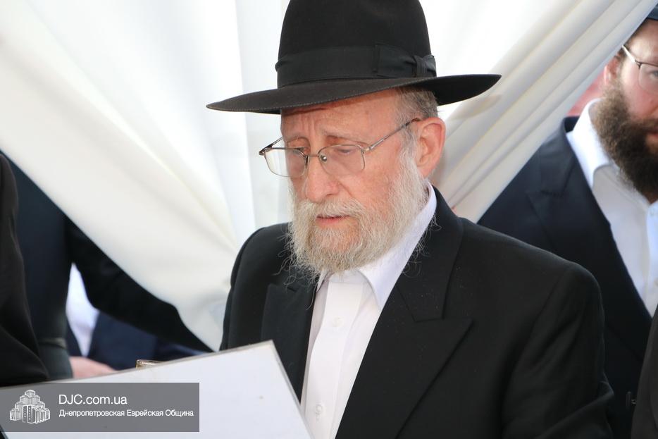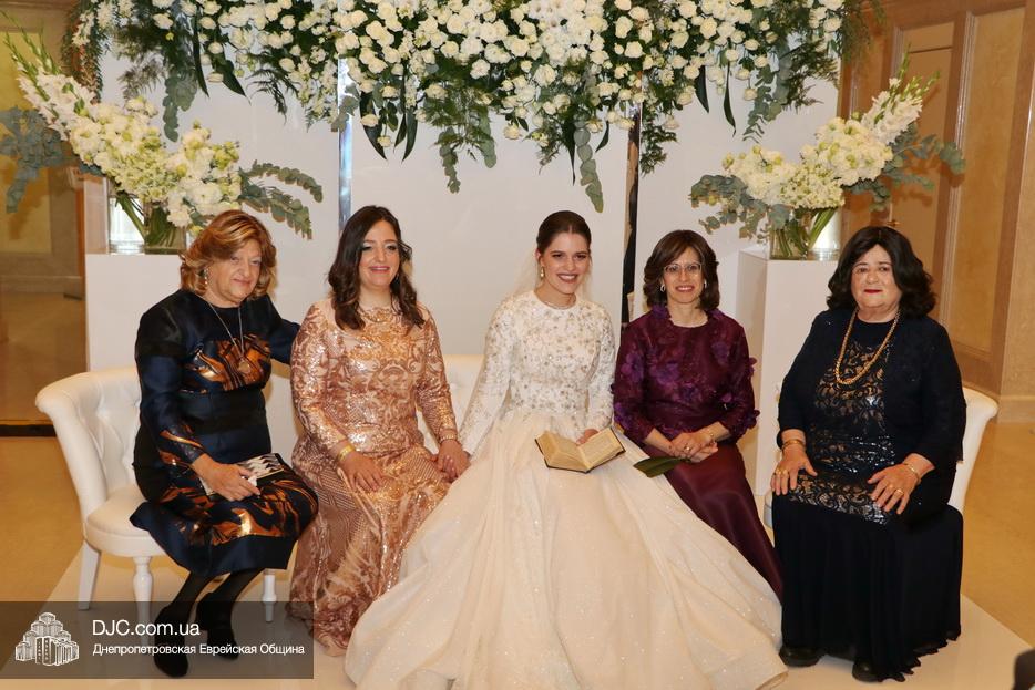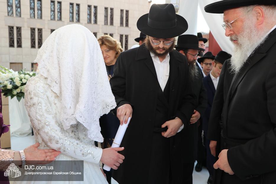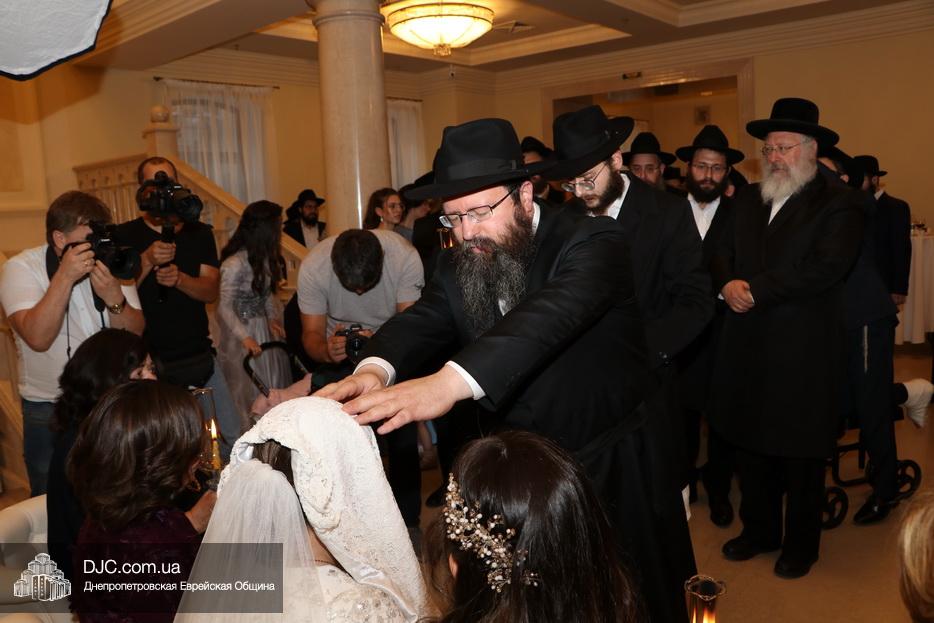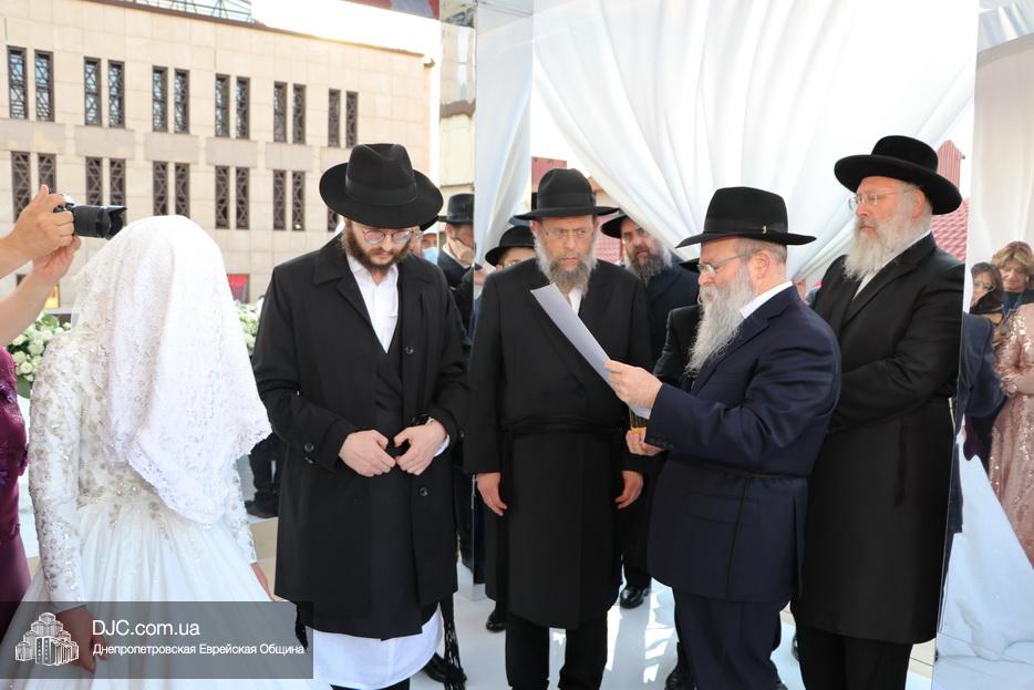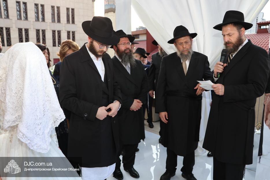 Затем прозвучали семь свадебных благословений: первые два прочел раввин Элиягу Столик (Бруклин, Нью-Йорк); третье – дядя невесты раввин Аарон Саломон (Кирьят Малахи, Израиль); четвертое благословение прочел дядя жениха раввин Йосеф Ланда (Лондон, Великобритания); пятое – дядя невесты раввин Биньомин Аксельрод (Петах Тиква, Израиль); а шестое – дядя жениха раввин Натан Винклер (Бней Брак, Израиль). Седьмое, заключительное благословение произнес Главный раввин Днепра и региона Шмуэль Каминецкий.