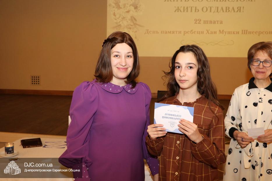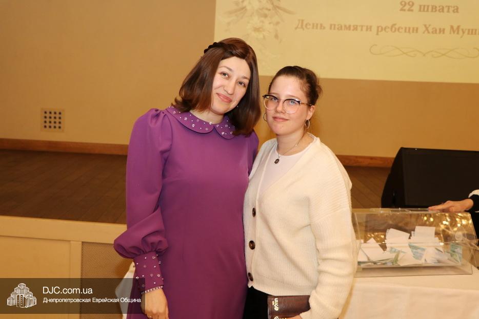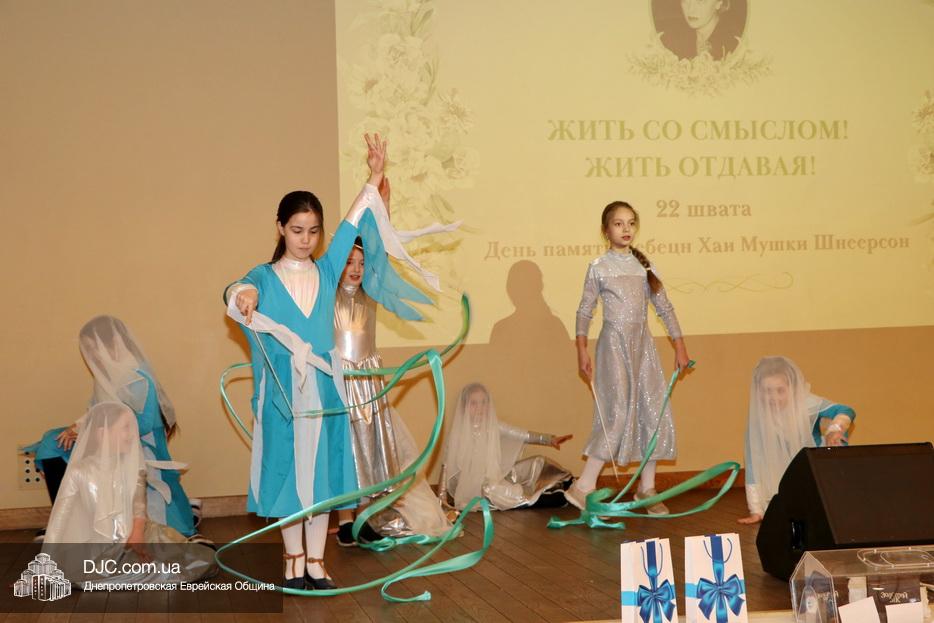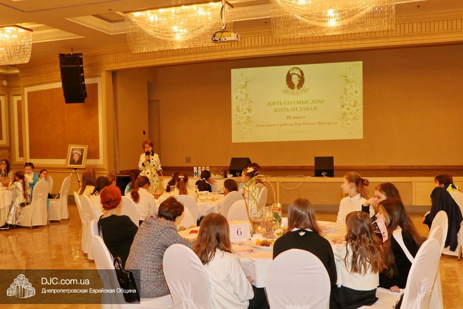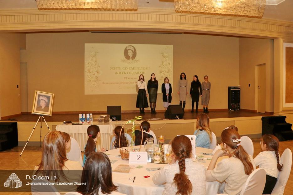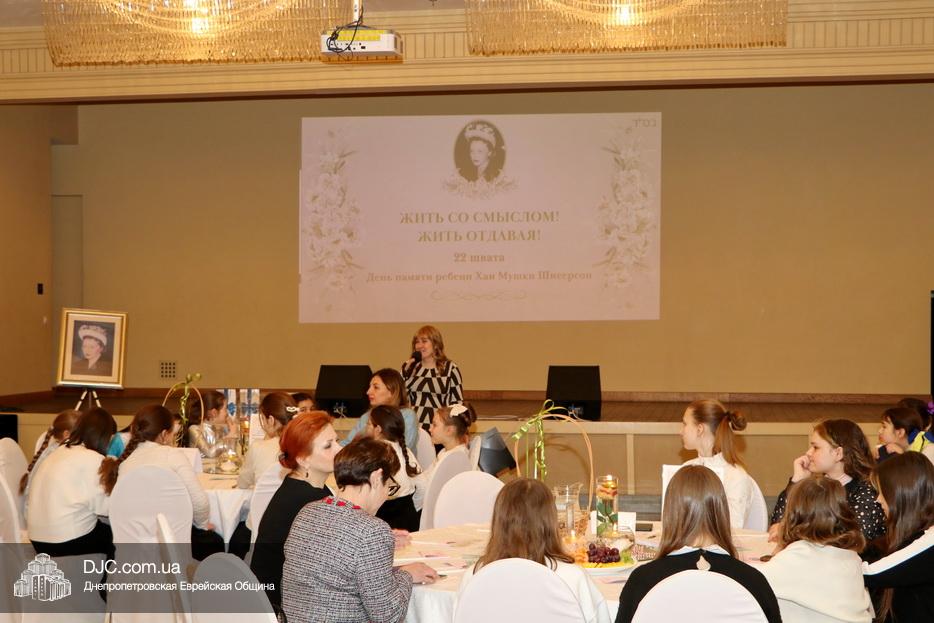 Мероприятие, подготовленное аморой Шейной Смилянской и аморой Мирьям Терешкевич, получило название «Жить со смыслом! Жить отдавая!» и было наполнено глубоким духовным содержанием. Свечу памяти в честь великой праведницы ребецн Хаи-Мушки Шнеерсон зажгла директор еврейской школы Днепра Елена Леонидовна Краснова.