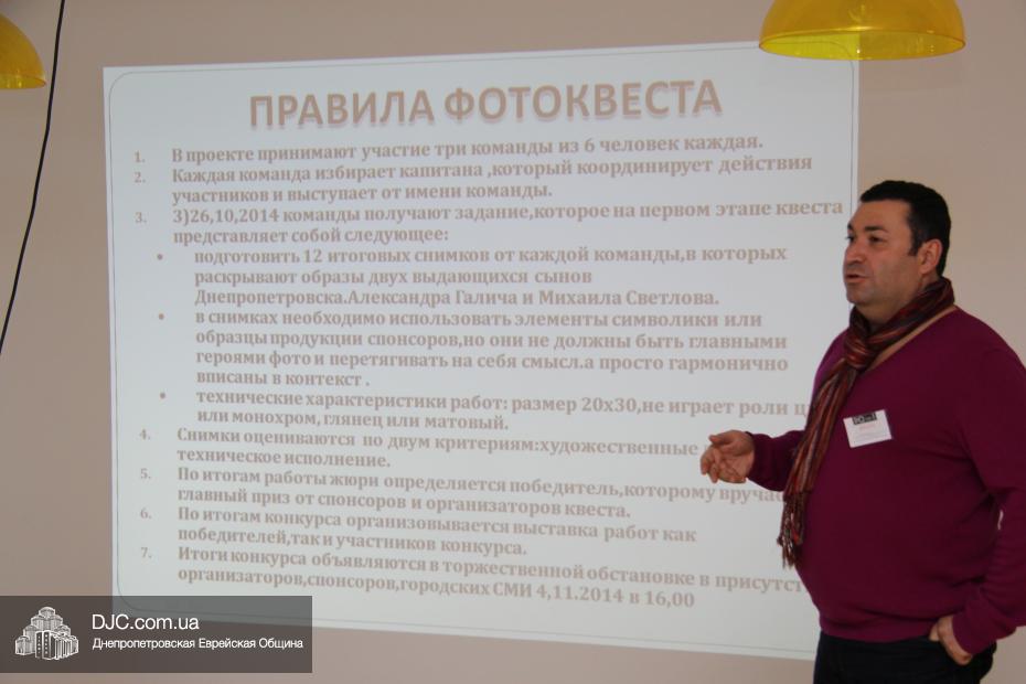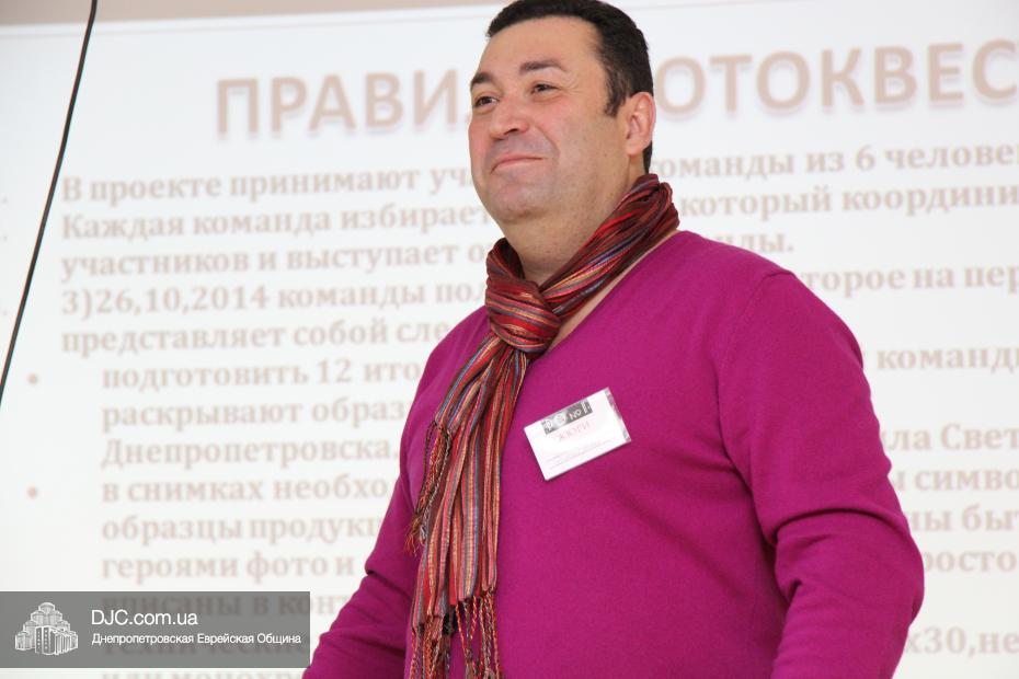 В Днепропетровске стартовал фотоквест, который носит название «The Great Judas» и позиционируется как первое в серии подобных мероприятий. Задача – познакомить молодежь с великими евреями города путем фотографирования с ассоциациями. А вот что именно и как именно надо «ассоциативно» фотографировать, объяснялось на вводном мероприятии, проведенном в зале «Шиурей Тора» инициатором и организатором фотоквеста Дмитрием Иткиным, членом Национального союза фотохудожников Украины.