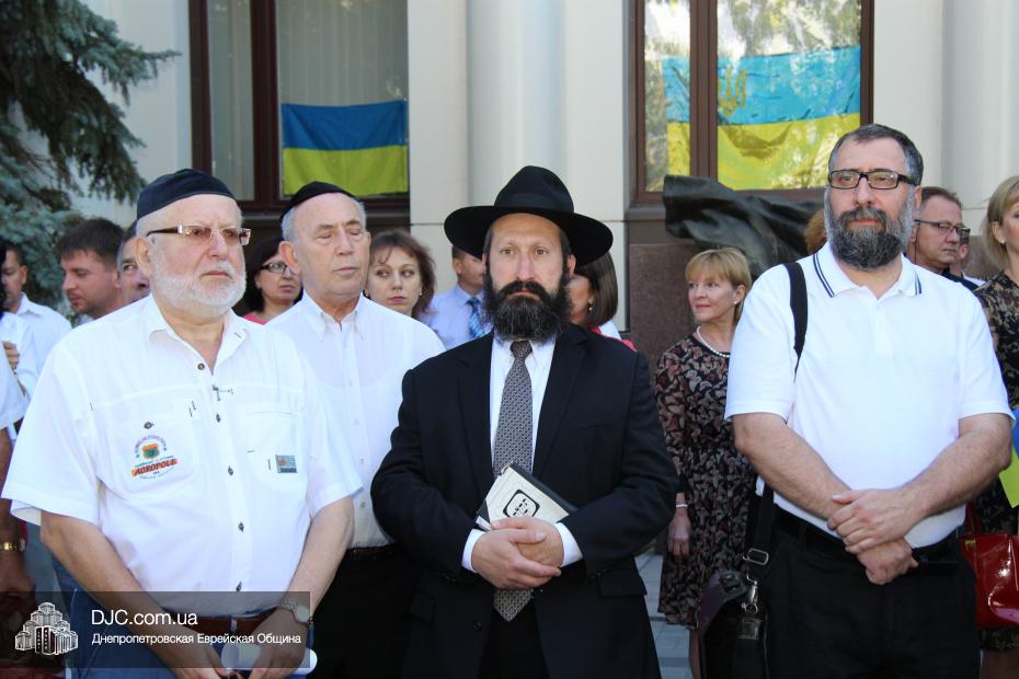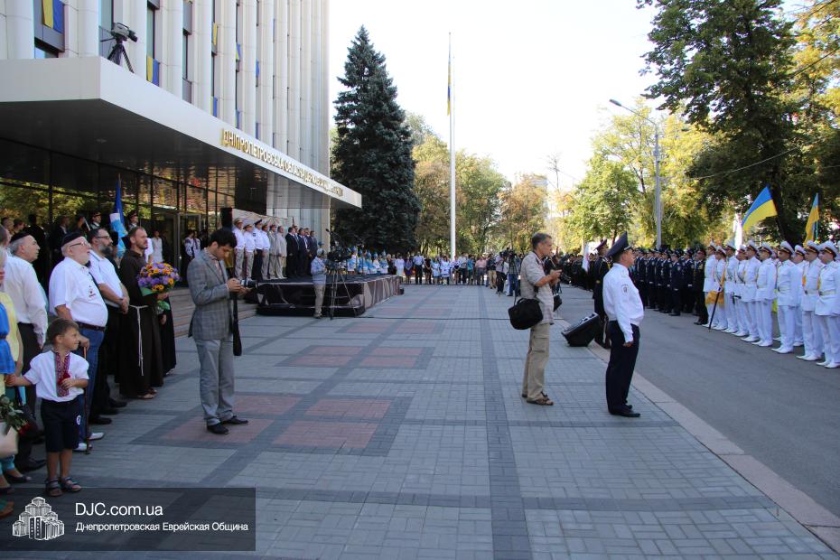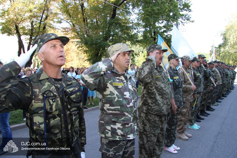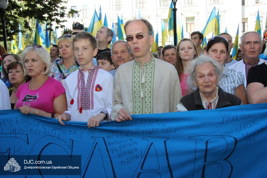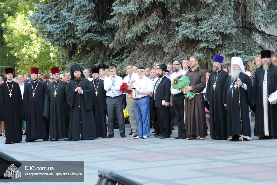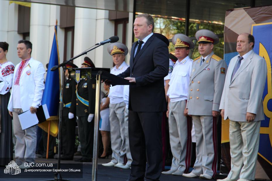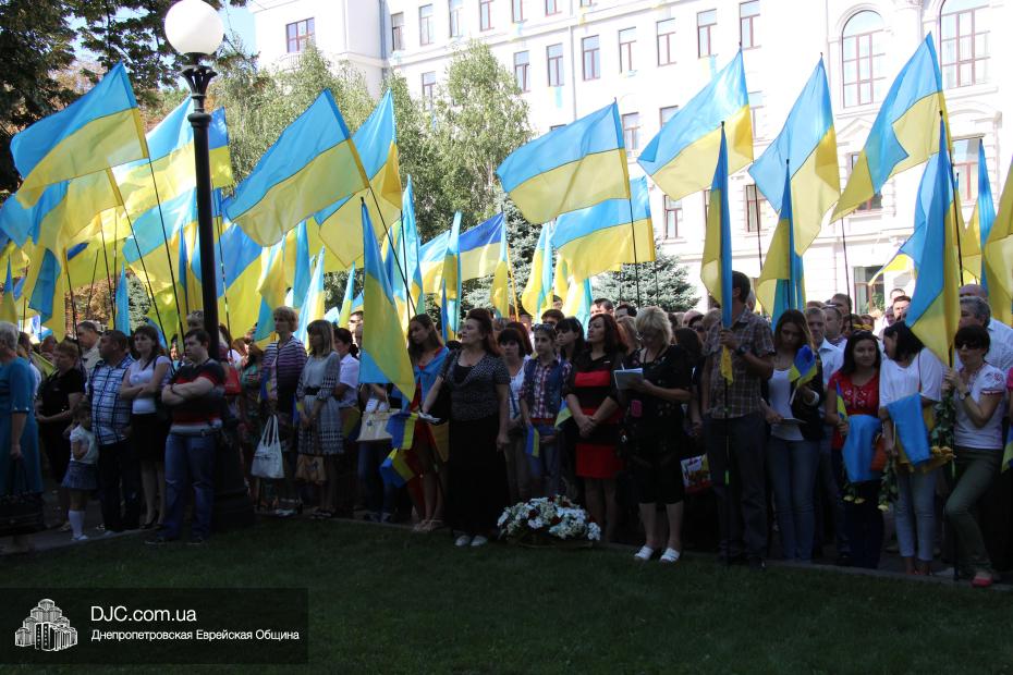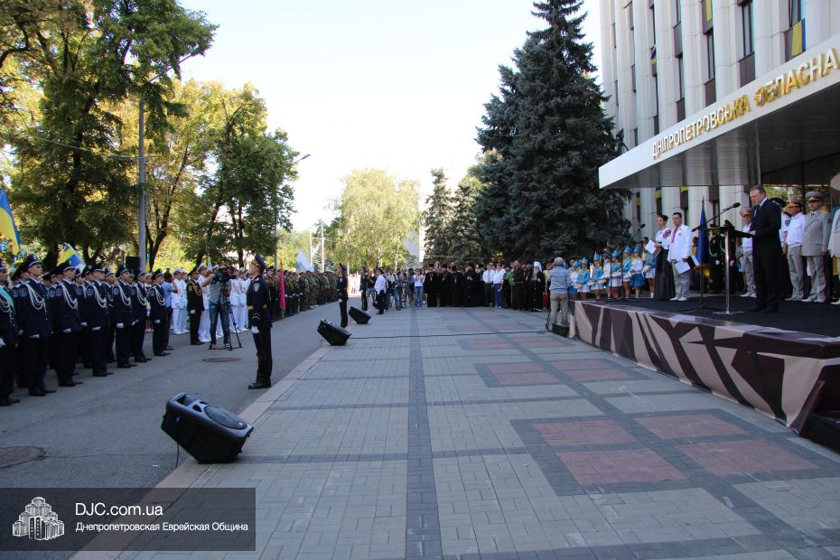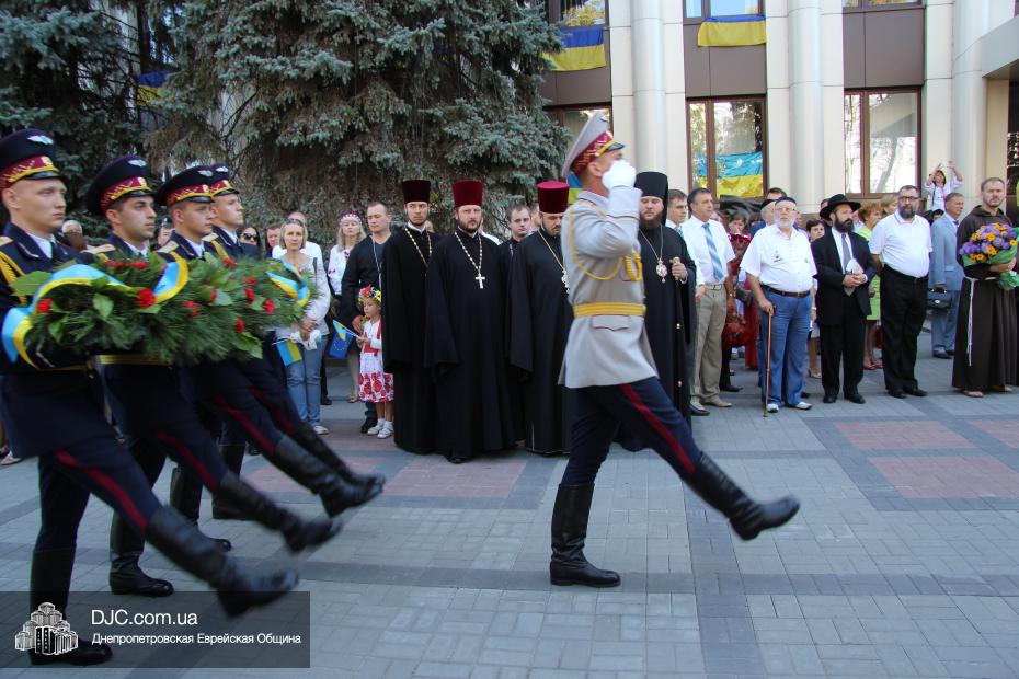 Руководители крупнейших религиозных организаций, вместе с руководством области, торжественно принимали небольшой парад днепропетровских силовых структур, почтили память павших защитников Отечества Минутой молчания и призвали Творца Вселенной благословить Украину и всех ее граждан. Еврейскую общину на церемонии официально представляли управляющий делами еврейской религиозной общины Александр Фридкис, член правления Олег Ростовцев, раввин Реувен Мильман и прихожанин Михаил Прискер, а многие члены Днепропетровской общины были среди тех, кто пришел под стены областной администрации продемонстрировать единство многонационального украинского народа, его готовность защищать свою землю от иноземных захватчиков и агрессоров.