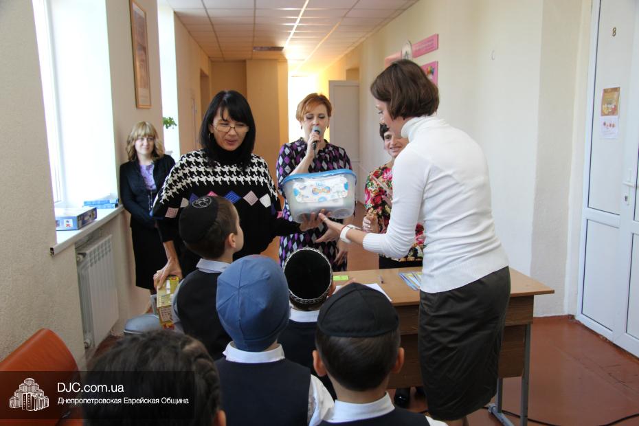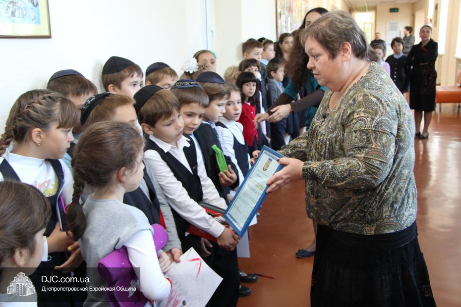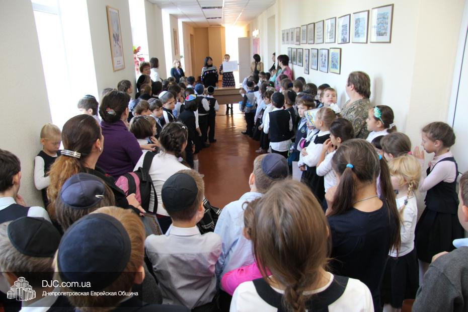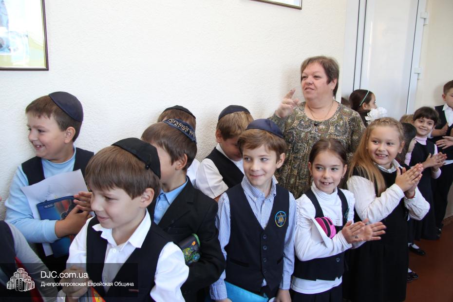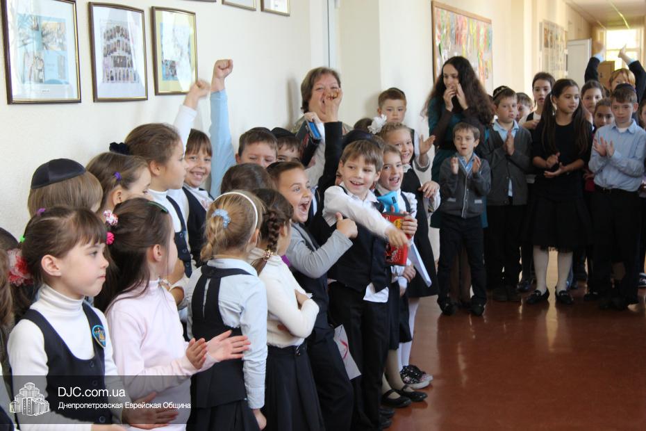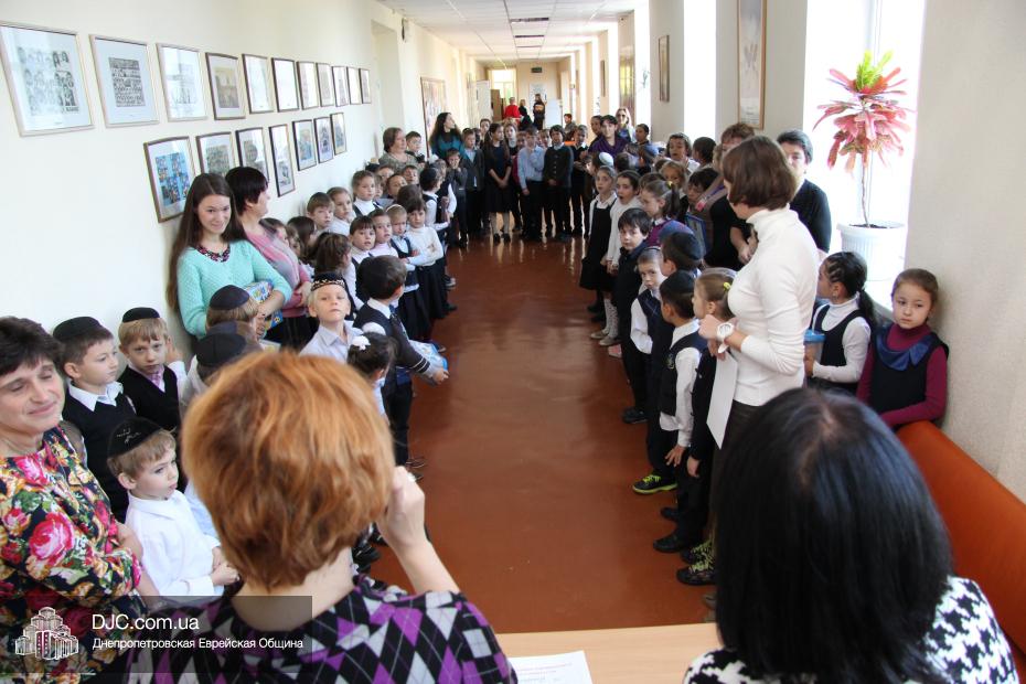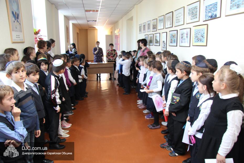 В ходе линейки администрация школы поздравила первоклассников с их первым месяцем учебы в еврейской школе Днепропетровска. Завуч младших классов Марина Кручинина передала классным руководителям первых классов и их воспитанникам наборы конструкторов «Лего», которые будут находиться в классных кабинетах для общего пользования. Марина Кручинина отметила, что она надеется, что ребята будут бережно относиться к конструкторам, и наборы, с помощью которых можно учиться играя, перейдут и к следующим поколениям первоклассников.