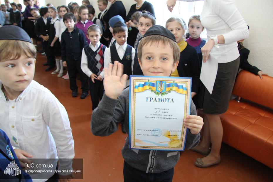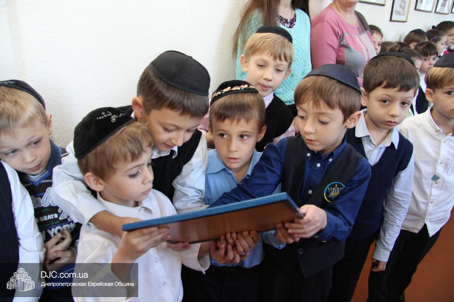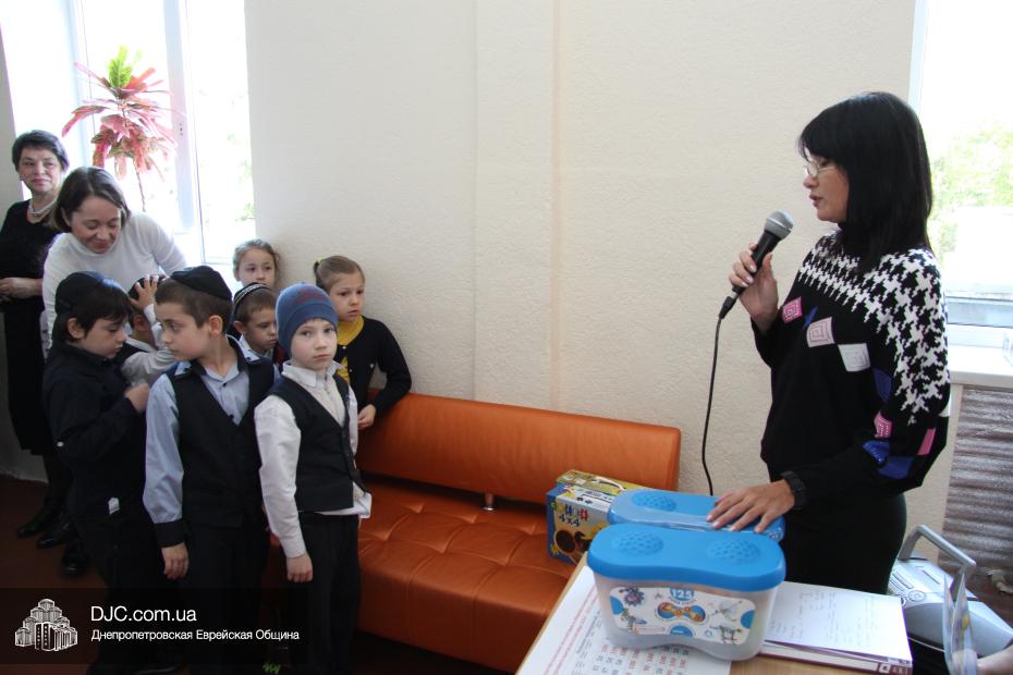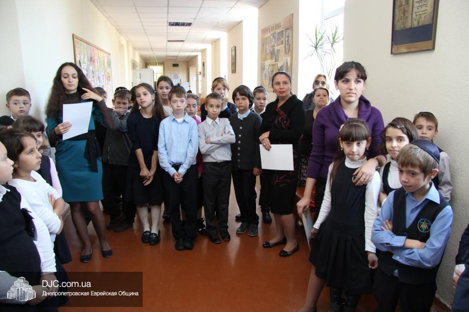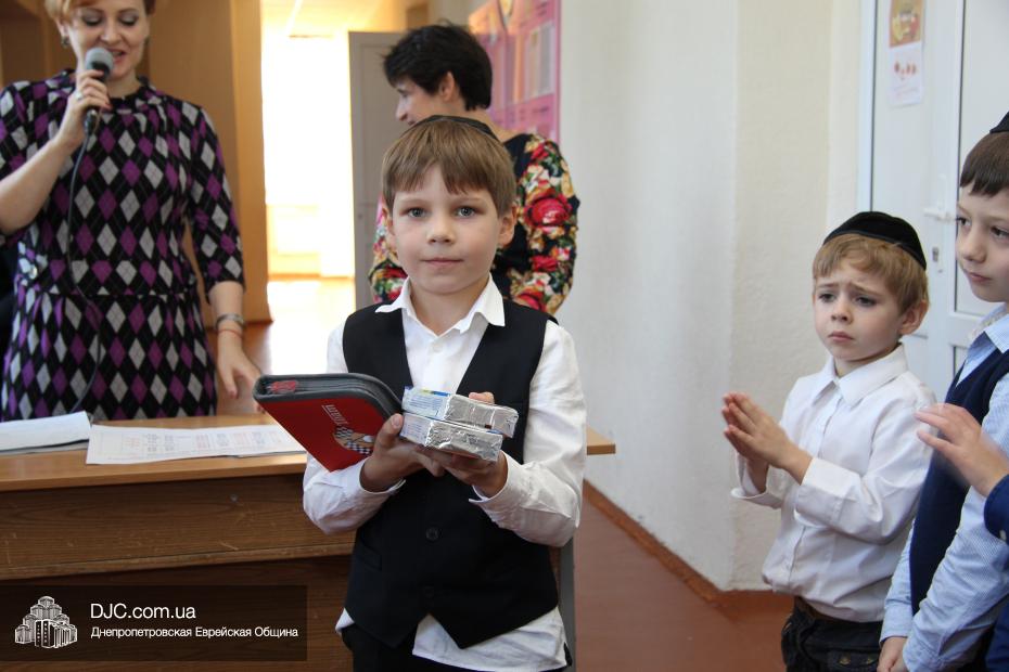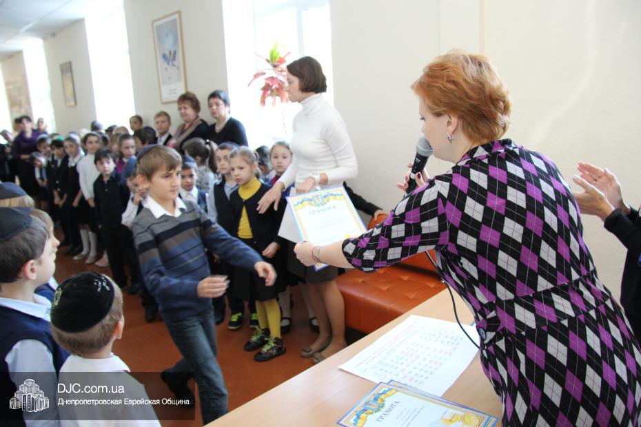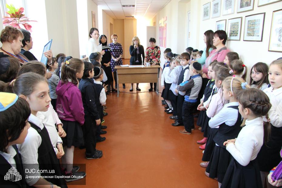 В ходе линейки администрация школы поздравила первоклассников с их первым месяцем учебы в еврейской школе Днепропетровска. Завуч младших классов Марина Кручинина передала классным руководителям первых классов и их воспитанникам наборы конструкторов «Лего», которые будут находиться в классных кабинетах для общего пользования. Марина Кручинина отметила, что она надеется, что ребята будут бережно относиться к конструкторам, и наборы, с помощью которых можно учиться играя, перейдут и к следующим поколениям первоклассников.