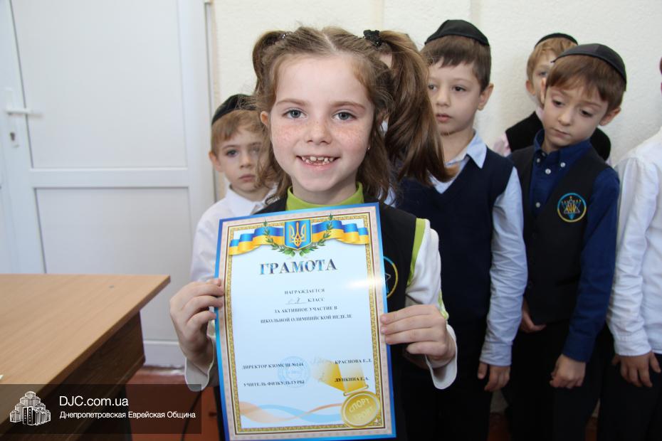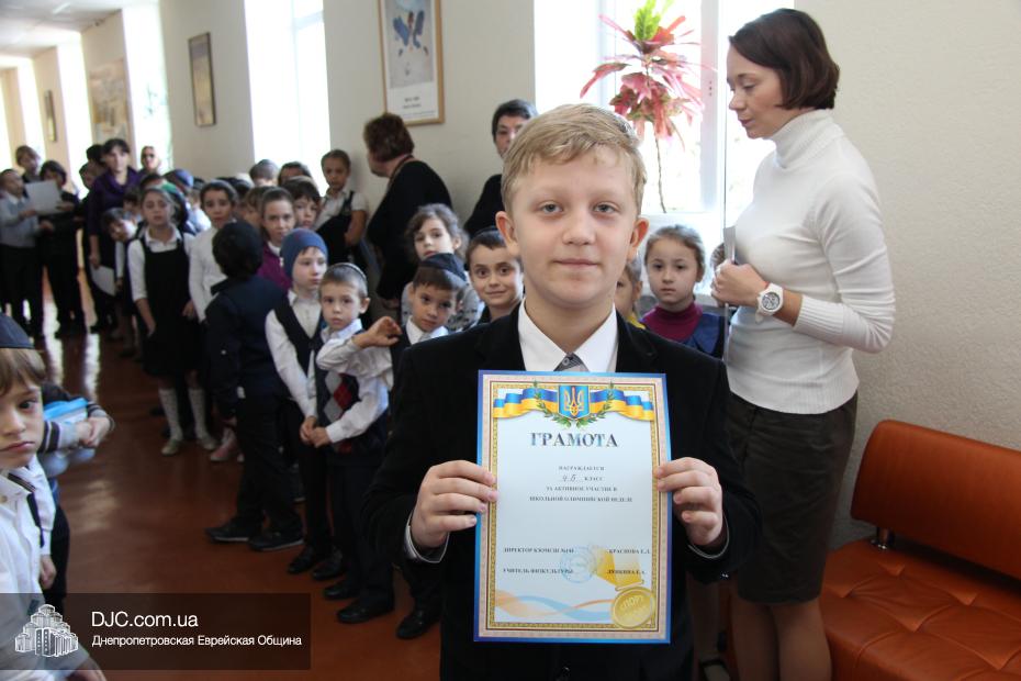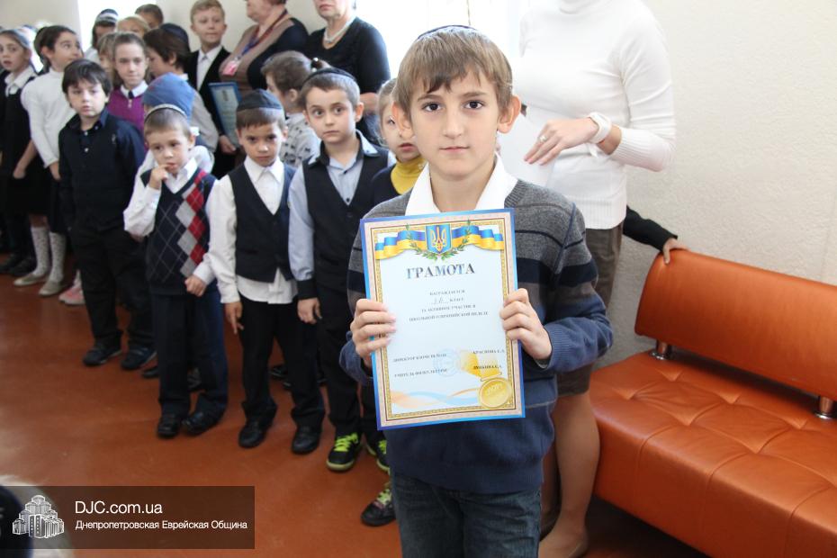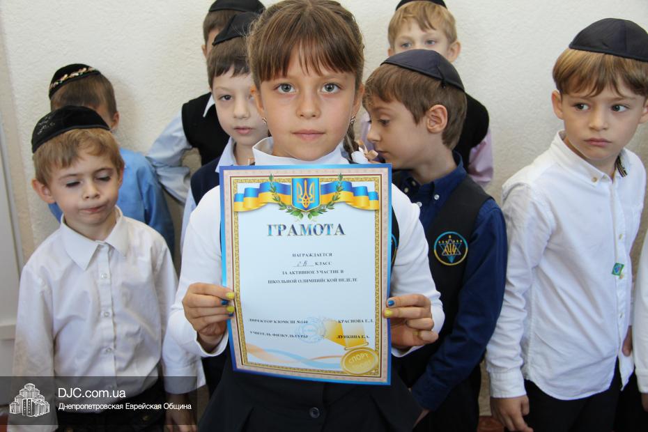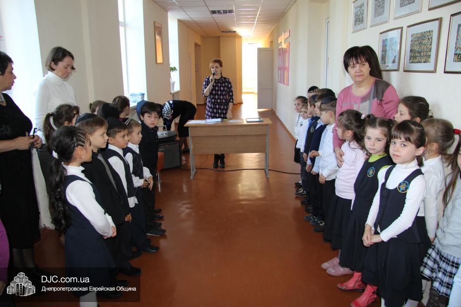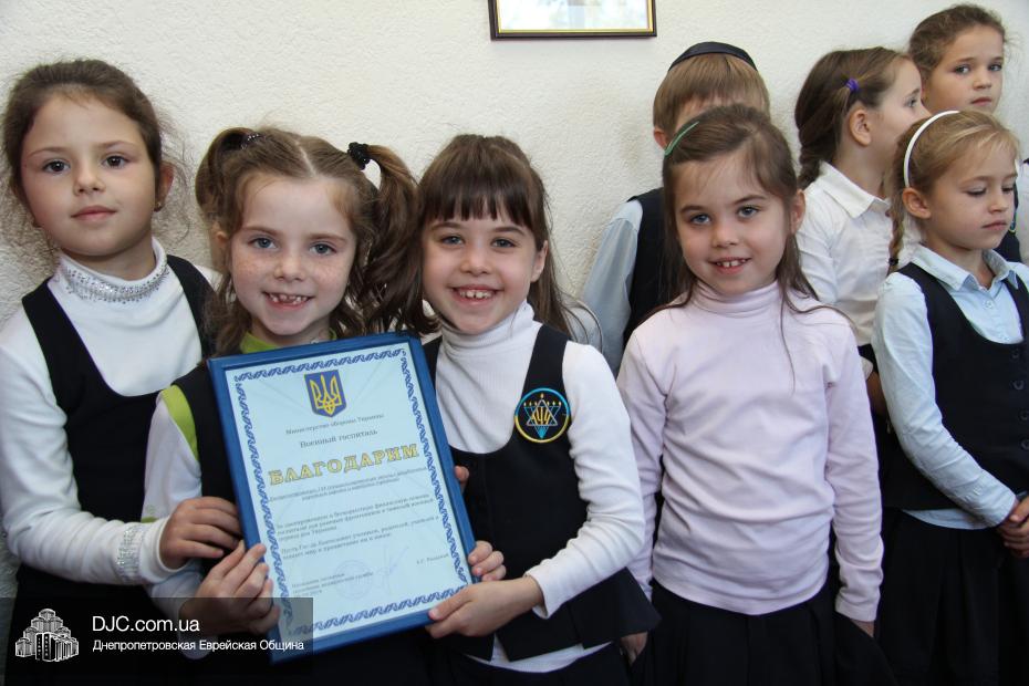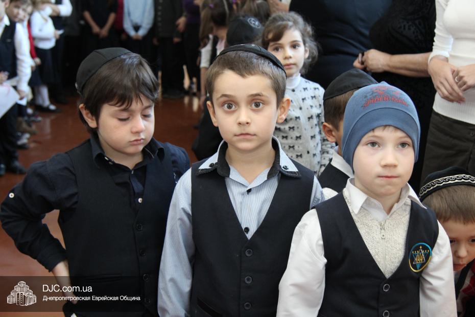 В ходе линейки администрация школы поздравила первоклассников с их первым месяцем учебы в еврейской школе Днепропетровска. Завуч младших классов Марина Кручинина передала классным руководителям первых классов и их воспитанникам наборы конструкторов «Лего», которые будут находиться в классных кабинетах для общего пользования. Марина Кручинина отметила, что она надеется, что ребята будут бережно относиться к конструкторам, и наборы, с помощью которых можно учиться играя, перейдут и к следующим поколениям первоклассников.