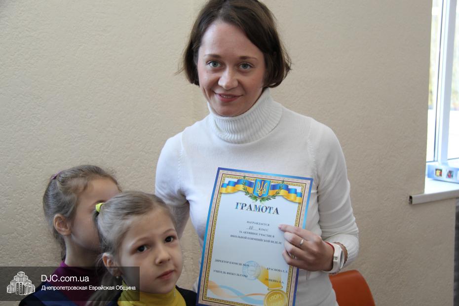 В завершение линейки все классы были торжественно награждены почетными грамотами «За участие в Олимпийской неделе» с подписью директора школы Елены Красновой и учителя физкультуры Елены Лункиной.