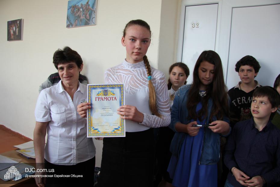 Награды были вручены семи девочкам в связи с их участием в «Областной дистанционной олимпиаде креативного развития по русскому языку и литературе ДОКа» – в группе «Юниор» Елизавете Шварцман (10-а) и Дарье Цопе (9-а), а в группе «Росток» восьмиклассницам Роми Мор, Власте Михайлюк и Софье Зайднер и семиклассницам Карине Даниловой и Александре Коток.