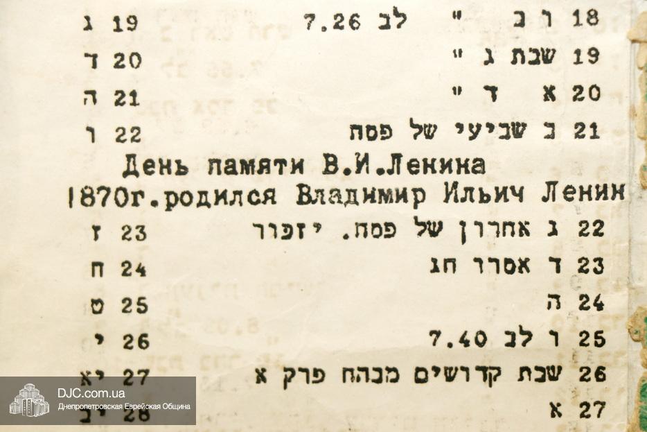 Про рукописный календарь даже известно, кто его создал и кому он принадлежал – Исаак Медведовский, житель города Новомосковска, теперь Самар. Следует отметить, что рукописный календарь полностью на иврите и в нем обозначены только еврейские религиозные праздники и памятные даты, а вот печатная продукция в значительной степени подверглась «советизации» — в них обозначены коммунистические даты, такие как День рождения Леннина, Первомай, день «Октябрьской Революции» и так далее. В календаре, изданном в 1976 году, кроме того, присутствует молитва за советское правительство.