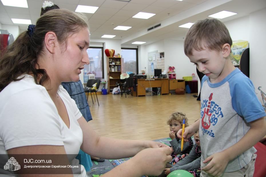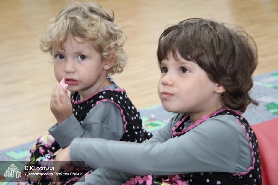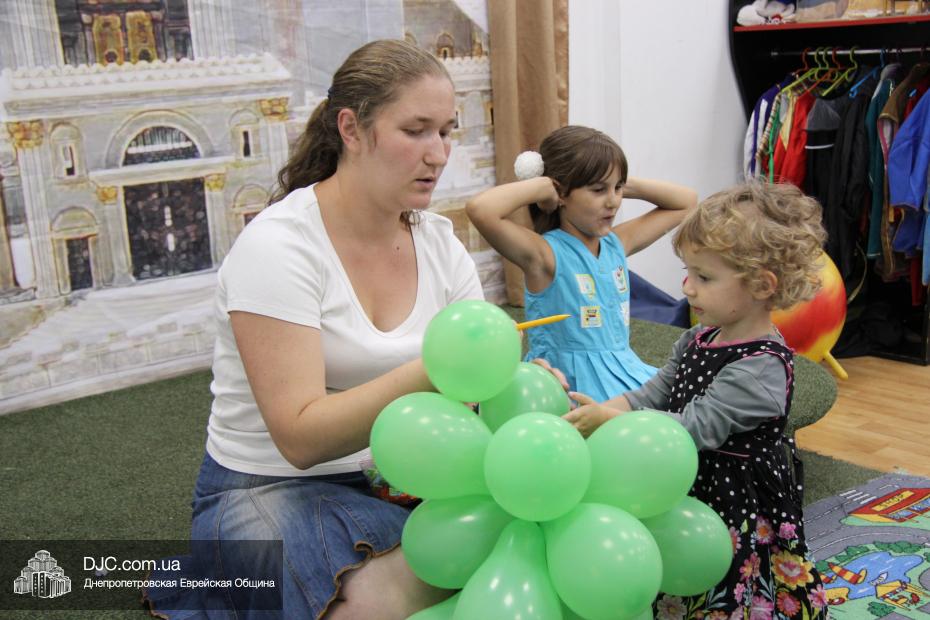 Главным символом этого фарбренгена стал виноград, напоминающий о древнем и красивом обычае еврейского народа. Специально для этого вечера воспитатели игровой комнаты сделали из зеленых надувных шариков виноградную гроздь. Малыши должны были по очереди «лопать» шарики. В каждой из «виноградин» было спрятано задание, которое нужно было выполнить ребенку: например, произнести один из 12 псуким, дать цдаку, поцеловать мезузу, посчитать на иврите до 10-ти, сказать, какую броху произносят перед тем, как съесть кекс. Были задания и полегче – помыть руки, три раза прокукарекать или попрыгать. Впрочем, выполнить любое из заданий не составило для малышей никакого труда.
