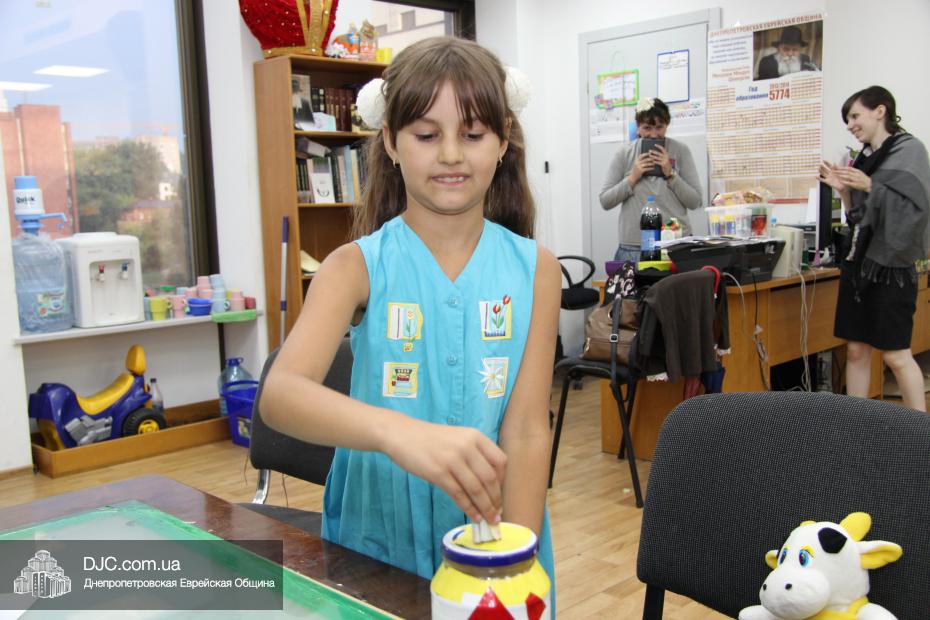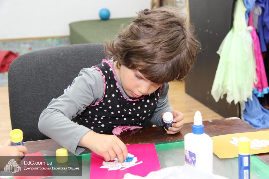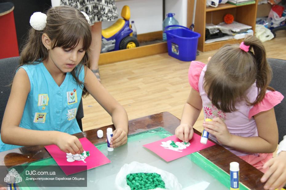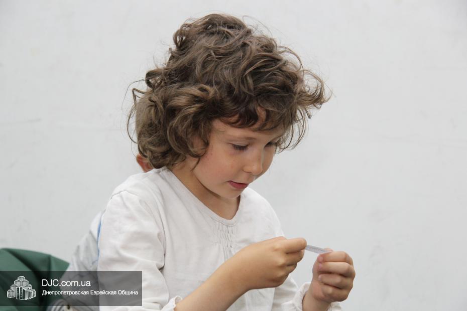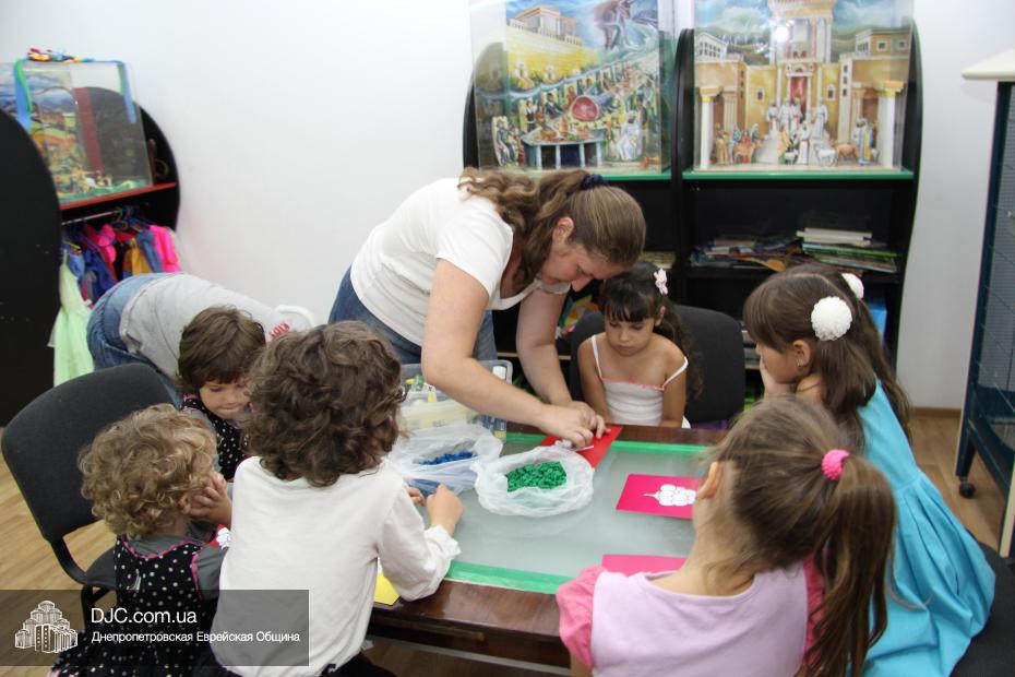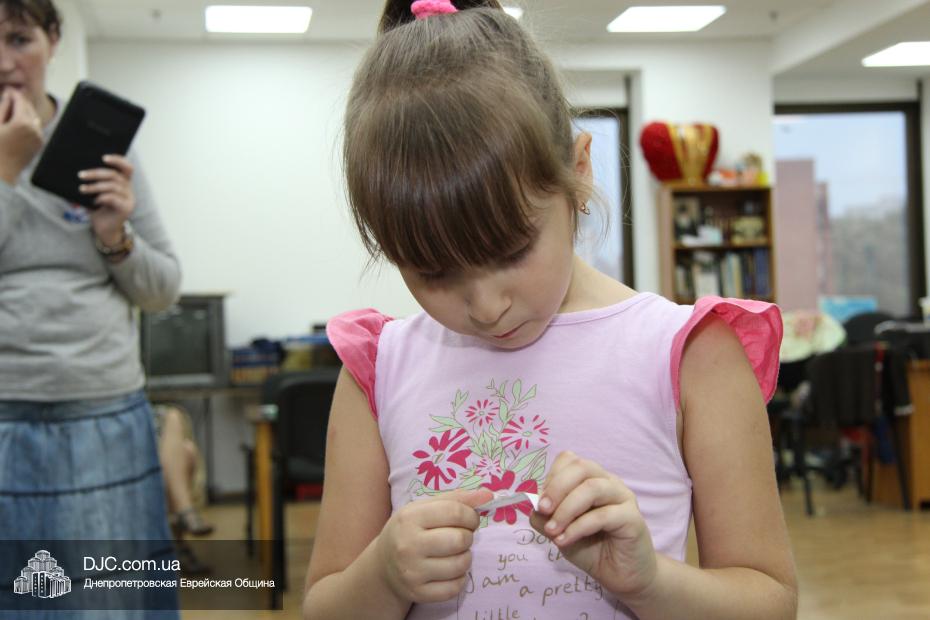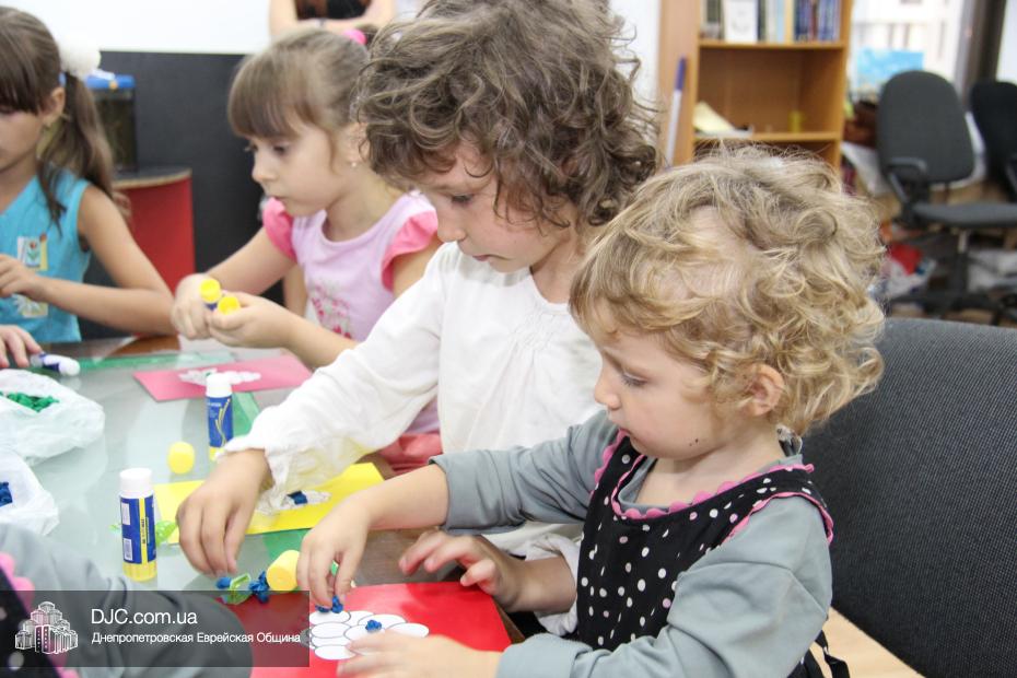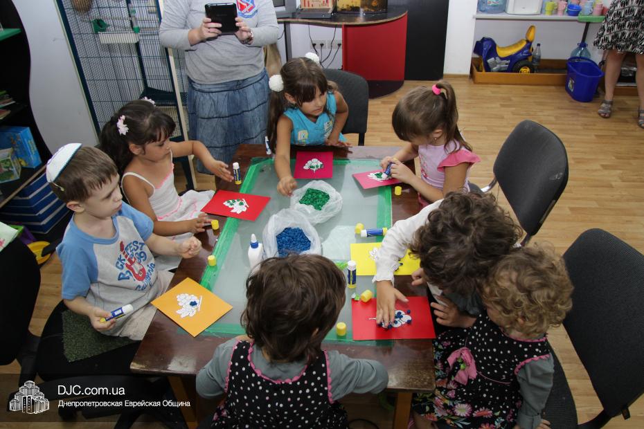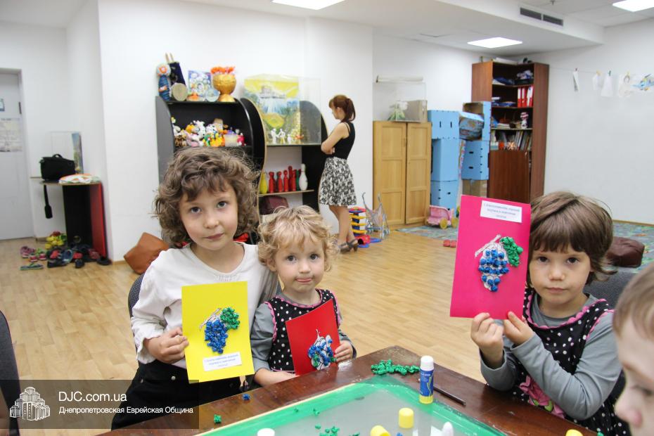 Затем маленьким участникам фарбренгена предстояло сделать праздничную открытку-аппликацию, наклеив на трафарет с изображением лозы виноградные «ягодки», а затем поместить на открытку пожелание «С благословением хорошей подписи и скрепления печатью!», которым Ребе предписал поздравлять друг друга с Рош А Шана.