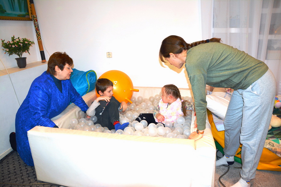 Цього разу комбіноване заняття проходило в сенсорній кімнаті, педагог використовувала дидактичний пуф «Сенсорна черепаха», фітбол (гімнастичний м’яч) та іграшку-конструктор. Спосіб переключення між видами діяльності теж був нестандартним – за допомогою феншуй-дзвіночків «Музика вітру». Запровадження різних видів роботи протягом заняття підтримує увагу учениці на високому рівні, служить розвитку уваги, мислення, мовлення та пам’яті.