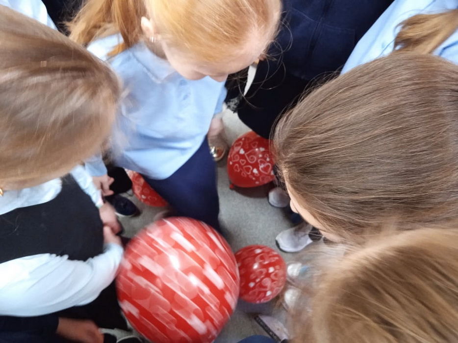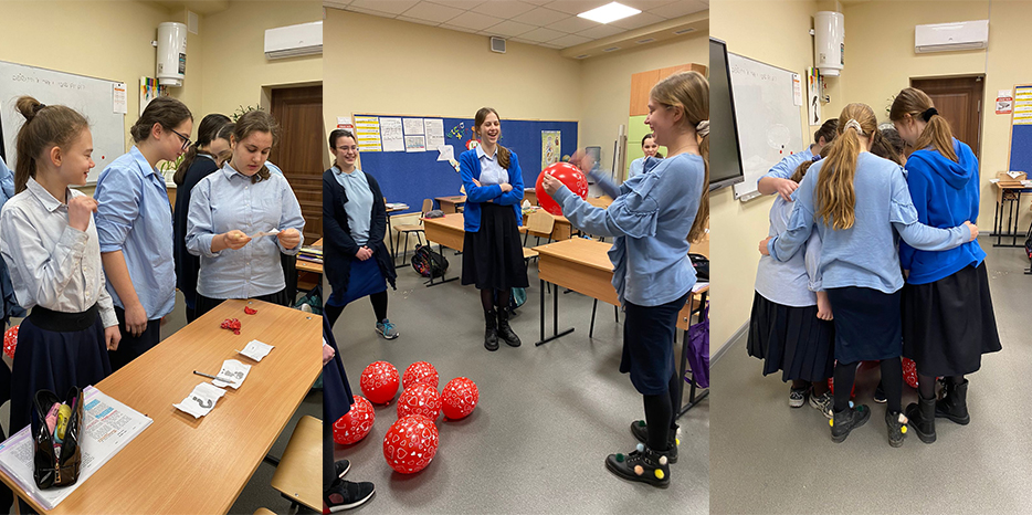 По условиям игры необходимо было лопнуть шарик, в котором находилась загадка, а таких шариков было шесть. А для того, чтобы лопнуть шарик, одной девочке из класса нужно было его вытолкнуть из круга своих одноклассниц. В общем, получилось очень весело и смешно.