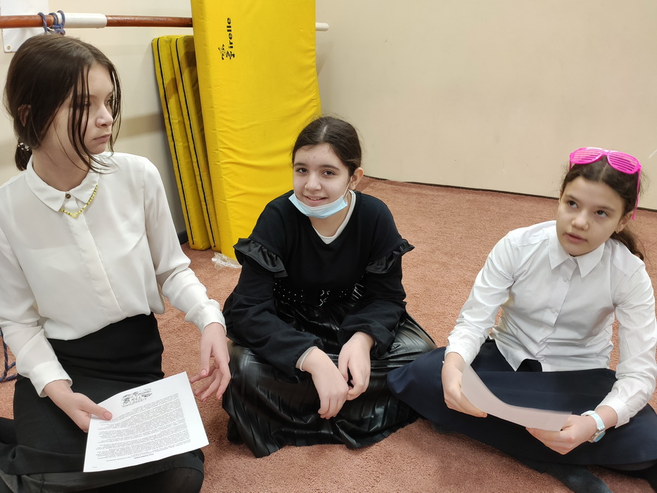Сначала в спортзале собрались ученицы старших классов, где воспитанницы получили информацию о месяце Адар, которую изучали в течение 10 минут, а затем играли в веселую игру, для того чтобы участвовать в игре нужно было ответить на вопрос, зашифрованный картинкой. Та девочка, которая ответила на вопрос, закрывала глаза и получала фото учителя или работника махона и должна была отгадать, кто же на фото, задавая вопросы всем остальным девочкам. Игра получилась очень веселой.