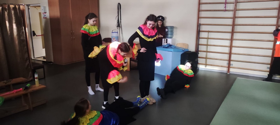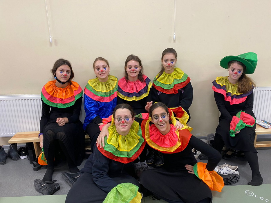 Для младших учениц программа началась с кинуса «Цивос Ашем» – девочки сказали 12 псуким, бросили монетку в цдоку, а затем всех младших девочек ожидал сюрприз – выступление веселых клоунов, которых исполнили ученицы десятого класса.
