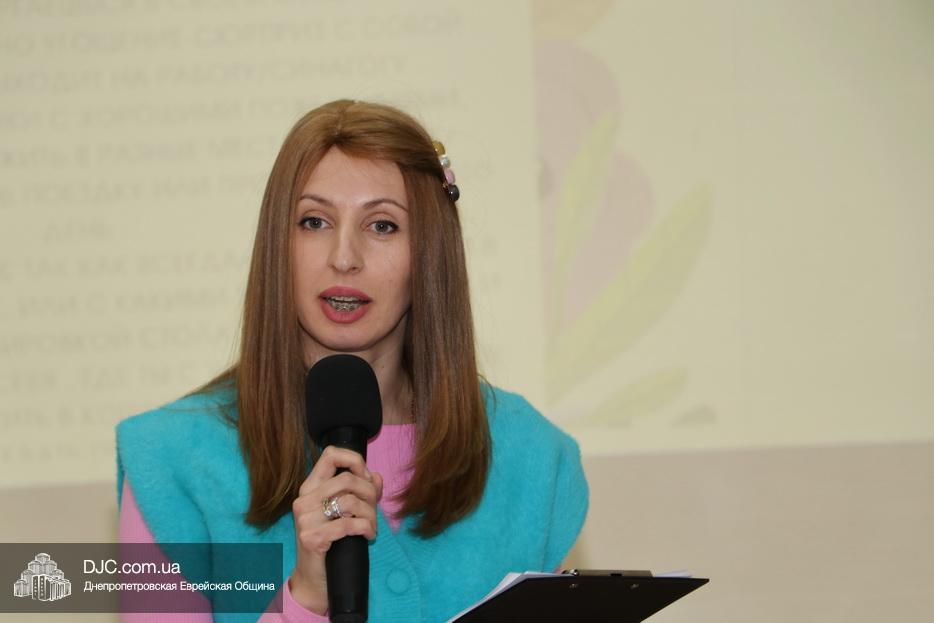 Открыла мероприятие ведущая фарбренгена Ализа Рабинович, которая рассказала о важности и особенностях даты 22 Швата, а затем пригласила выступить психолога, специалиста по вопросам семейной гармонии, маму девятерых детей и счастливую еврейскую женщину, посланницу Ребе – Ривку Немой.