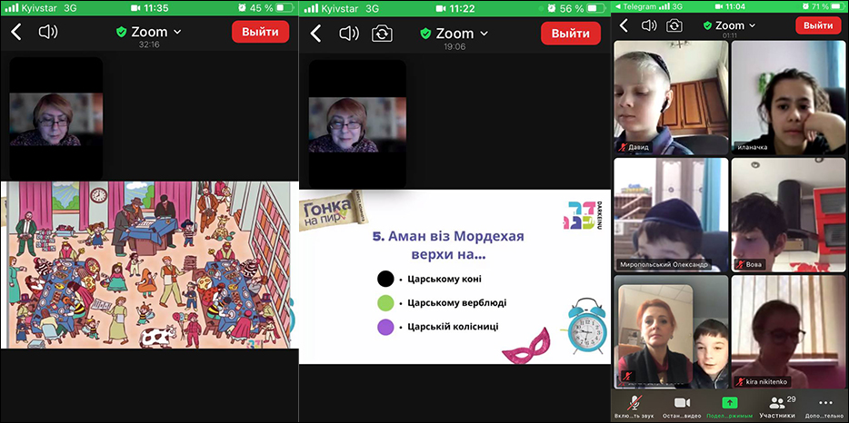 Захід для учнів 2-6 класів провела вчителька івриту Ірина Кригер: «Діти прослухали, що казав для них Сьомий Любавицький Ребе Менахем-Мендел Шнеєрсон з нагоди свята Пурім, та узнали, як важливо саме їм збиратися разом, пам’ятати про тих рідних та друзів, які зараз далеко, спілкуватися з ними, обов’язково вивчати Тору і обов’язково робити добрі справи, щоб покращити наш світ, щоб все в ньому перевернулось на найкраще. Бо те, що коїться в матеріальному світі є відображення того, що робиться в духовному. Діти побували в гостях у цариці Естер, виконували різні цікаві завдання, щоб допомогти цариці підготувати пір для царя Ахашвероша та його радника».