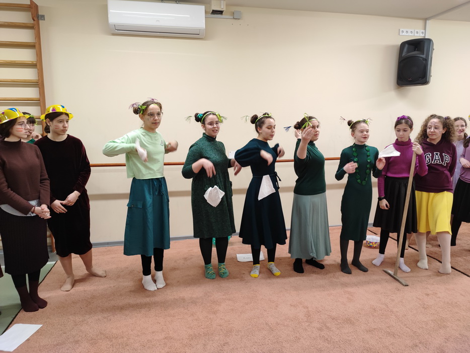 Во-вторых, каждому классу заранее раздали отрывок из песни с мелодией, на который девочки должны были придумать движения. И утром в день праздника ученицы махона собрались в спортзале. Сначала девочки посмотрели небольшой видеофильм, который подготовили ученицы 8 класса, он был связан с темой праздника «Радость работы». Затем состоялась смешная викторина, в которой принимали участие сразу все ученицы.