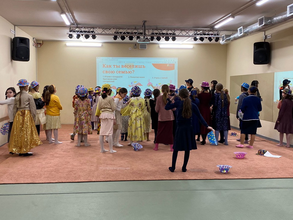 После этого все услышали звуки знакомой мелодии, к которой девочки готовили движения, и когда на экране появлялся определенный цвет, то девочки в одежде этого цвета показывали свои движения. Получилось очень интересно и весело.