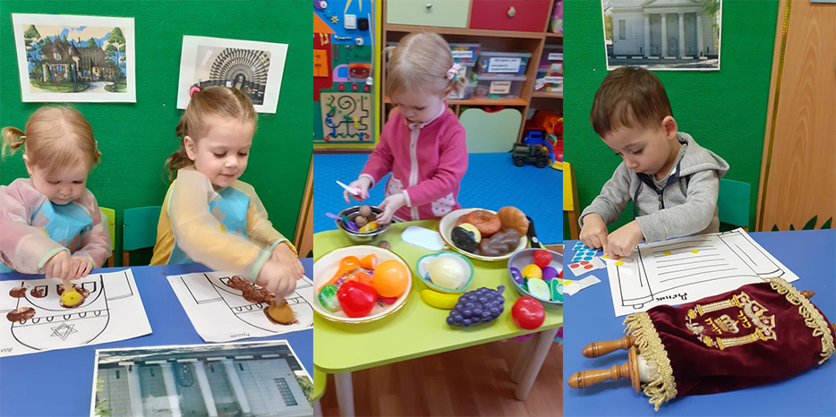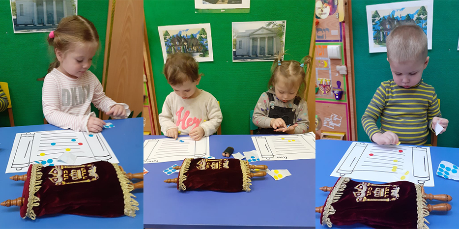 «Каждую тему недели мы с нашими малышами изучаем на всех занятиях, – рассказала нашему сайту Двора Фурлендер, руководитель программ еврейского компонента, – мы пытаемся дать им разностороннее понимание темы, и несомненно, все занятия проходили в игровой форме, с учетом возраста наших ребятишек. Так на занятии по ручному труду раскрашивали синагогу, на аппликации – украшали наклейками «Свиток Торы», при этом не забывая развивать мелкую моторику рук, а также воспитывать любовь к творчеству.
