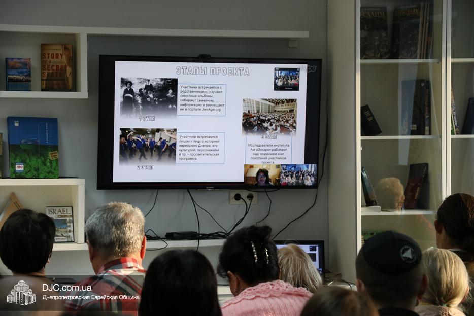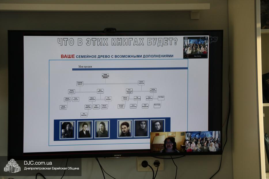 Подробнее о содержании и формах работы проекта собравшимся рассказала по cкайпу госпожа Малки Хагуэль-Шпицберг, директор проектов института «Ам ха-Зикарон». Она поведала, что суть проекта в том, чтобы собрать как можно больше сведений о еврейских семьях, их родственных связях, фактах жизни, в общем, обо всем, что может лечь в основу большой базы данных, которая будет использоваться для самых разнообразных целей. Участники проекта, которые должны заполнить анкеты и предоставить самые различные материалы, включая фотографии, постараться узнать у представителей старшего поколения и передать организаторам максимальный объем фактажа обо всех родственниках, датах и местах, в конце проекта получат «Книгу поколений своей семьи», как артефакт личной истории, которая благодаря Институту станет частью истории общественной.