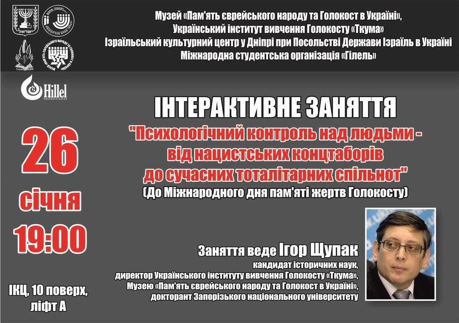 К Международному дню Холокоста в Израильском Культурном Центре Днепра при Посольстве государства Израиль в Украине пройдет лекция-интерактивное занятие доктора Игоря Щупака на тему: «Психологический контроль над людьми – от нацистских концлагерей до современных тоталитарных сообществ».