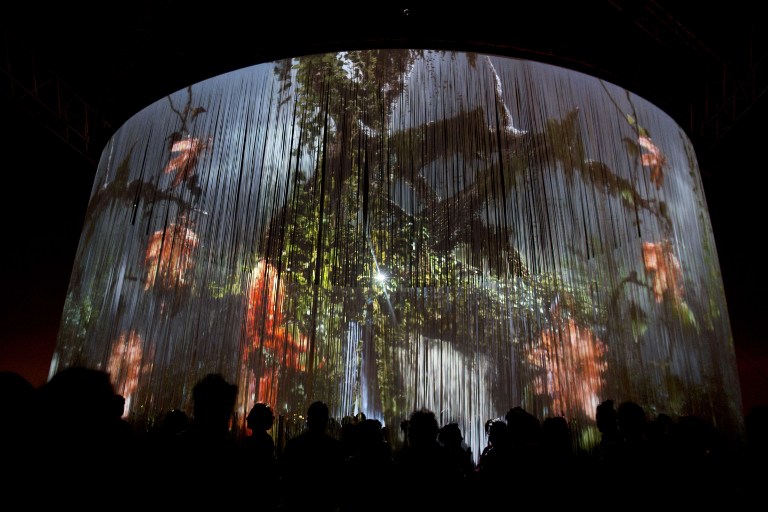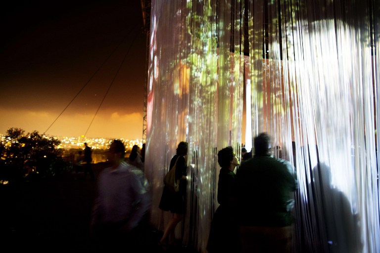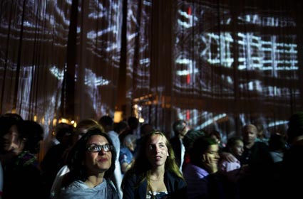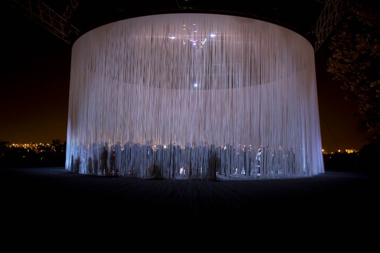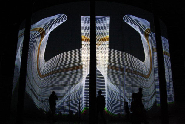 Правильное название диковинки – «Curtain call», автором проекта которой является знаменитый израильский дизайнер и художник Рон Арад. Он считается гением дизайна, прежде всего промышленного. Свою «камеру-обскуру XXI века» он сделал в виде цилиндра из 5600 силиконовых трубок, подвешенных на высоте восьми метров. Если находиться снаружи – можно ходить вокруг и смотреть кино, хотя весь экран с одной точки и не увидишь, но зрелище фильма на святящемся «стакане» должно радовать, в первую очередь молодежь и интеллектуалов. Но гениальность Арада в том, что можно войти внутрь, всего лишь раздвинув трубки – и все увидеть изнутри – как в настоящей панораме. Поистине, воплощение знаменитой фразы братьев Стругацких – «у ней внутре!»
