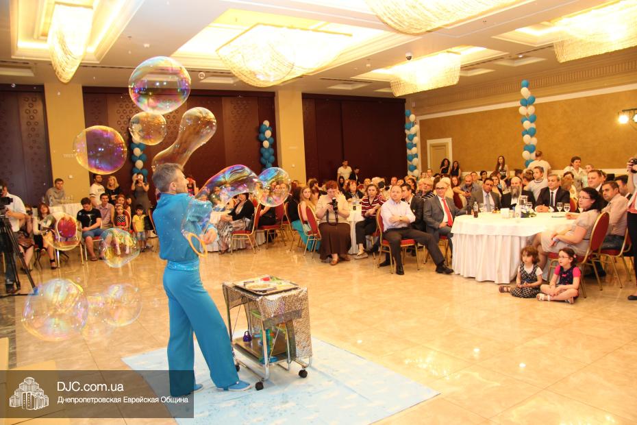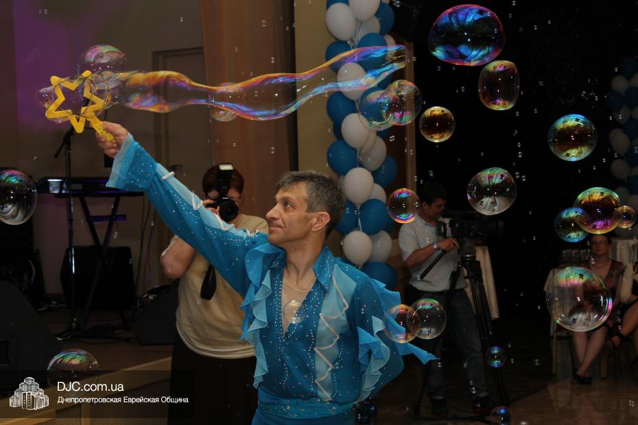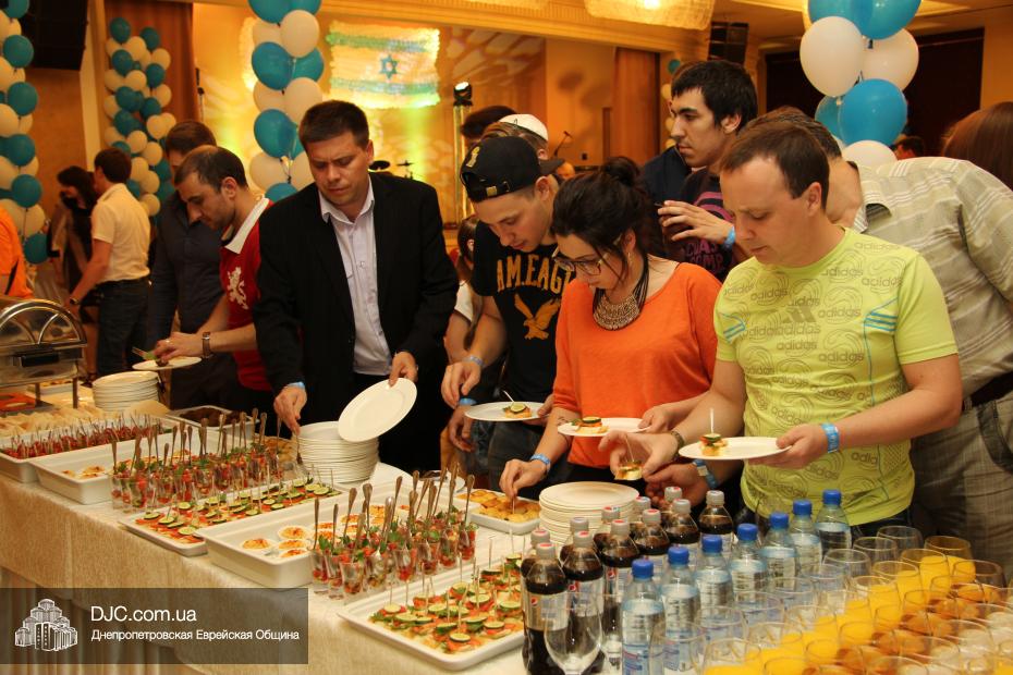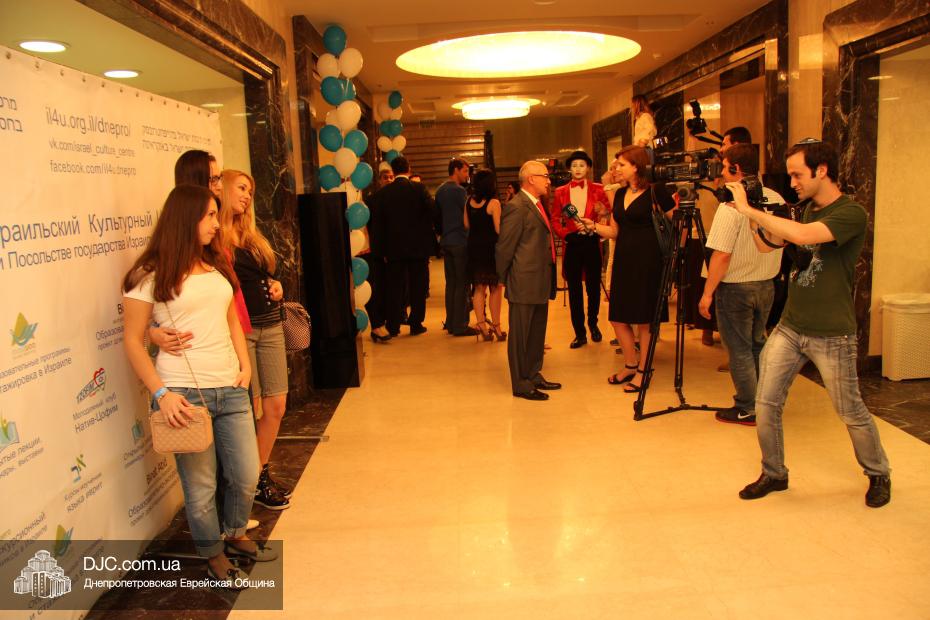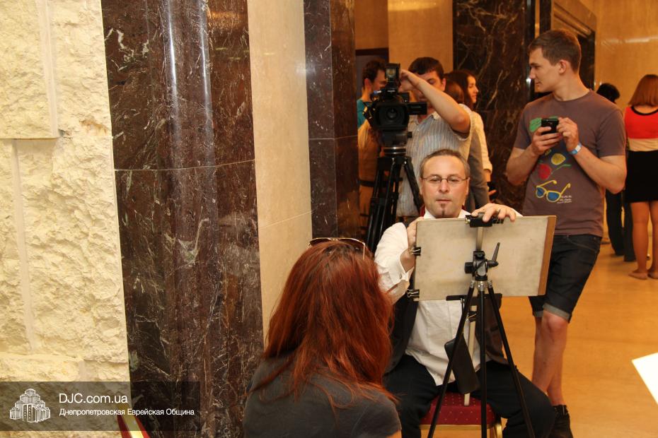 Современный и немного постмодернистский характер праздника задавала выставка фотографий о современном Израиле, мимы, шаржист и даже великан. Пока журналисты брали интервью, все могли начать с фуршета, и уже с закусками удобно расположиться за столами. Ведущий мероприятия Сергей Сачковский отметил, что праздновать День рождения Израиля, кроме днепропетровцев, приехали представители Запорожья, Киева и Донецка.